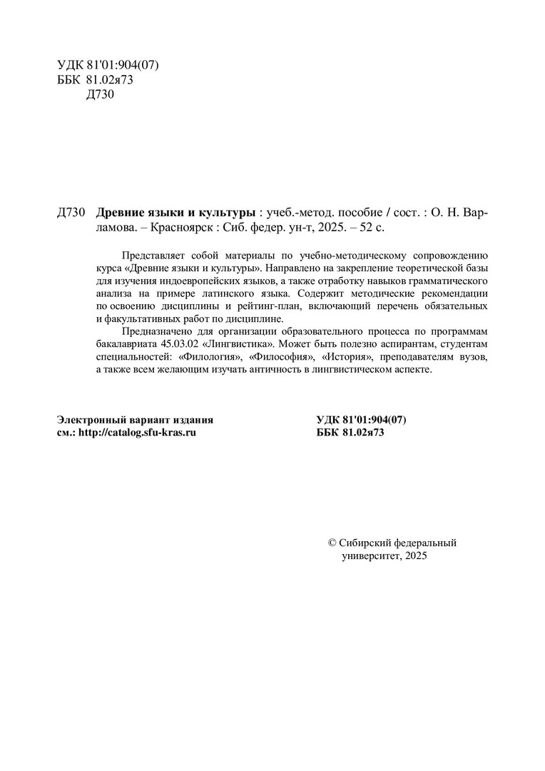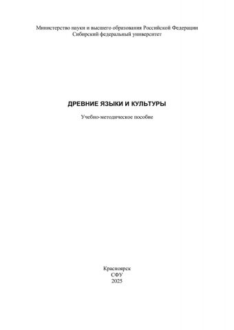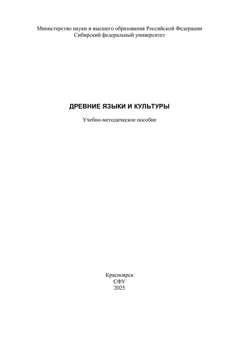 Библиографическое описание: Древние языки и культуры : учебно-методическое пособие / Сибирский федеральный университет, Институт филологии и языковой коммуникации ; сост. О. Н. Варламова. - Электрон. текстовые дан. (1,3 Мб). - Красноярск : СФУ, 2025 (2025-02-13). - 52 с., 3.0 усл. печ. л. : ил., цв. ил., табл. - Загл. с титул. экрана. - Электрон. версия печ. публикации . - Библиогр.: с. 50. - 100 экз. - Изд. № 2025-23803 : Б. ц. - Текст : электронный.