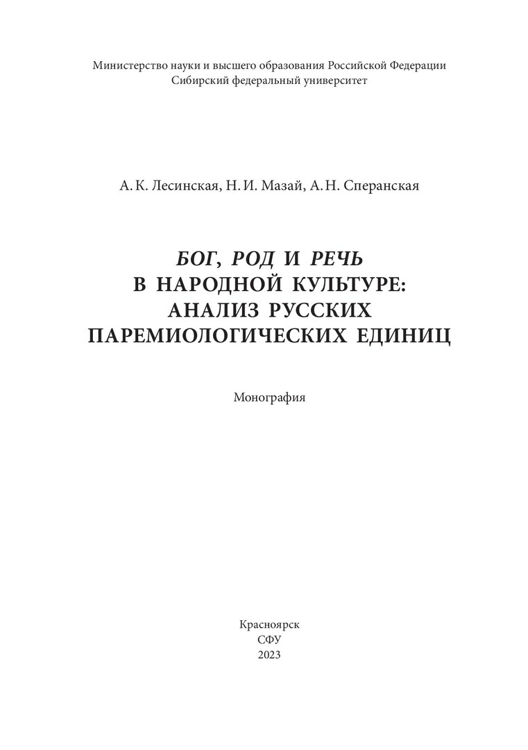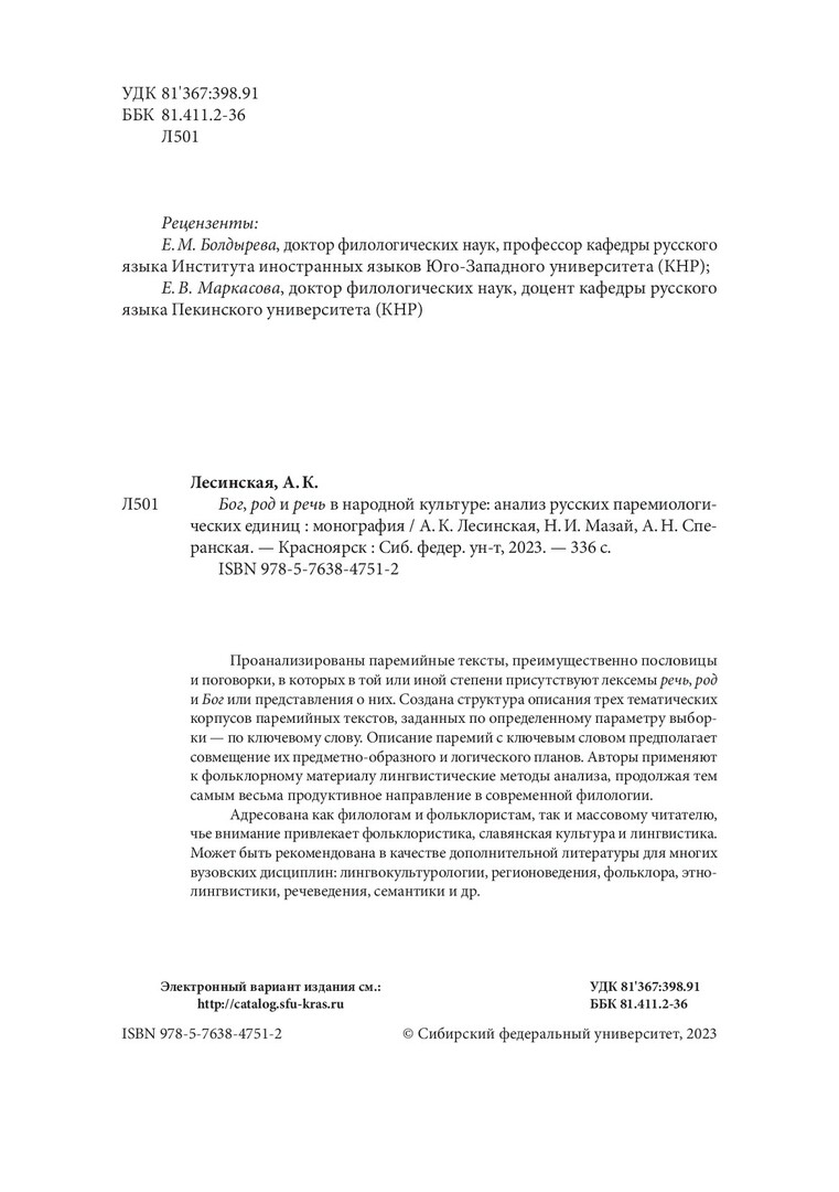 Библиографическое описание: Лесинская, Анастасия Константиновна. Бог, род и речь в народной культуре: анализ русских паремиологических единиц : монография / А. К. Лесинская, Н. И. Мазай, А. Н. Сперанская ; рец.: Е. М. Болдырева, Е. В. Маркасова ; Сибирский федеральный университет, Институт филологии и языковой коммуникации. - Электрон. текстовые дан. (2,8 Мб). - Красноярск : СФУ, 2023 (2023-12-28). - 336 с., 21.0 усл. печ. л. - Загл. с титул. экрана. - Электрон. версия печ. публикации . - Библиогр.: с. 310-335. - 500 экз. - ISBN 978-5-7638-4751-2 : Б. ц. - Изд. № 2022-17243. - Текст : электронный.