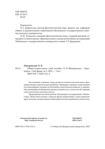 Библиографическое описание: Магировская, Оксана Валериевна. Общая теория языка : учебное пособие / О. В. Магировская ; рец.: О. Г. Дубровская, И. Н. Толмачева ; Сибирский федеральный университет, Институт филологии и языковой коммуникации. - Электрон. текстовые дан. (pdf, 0.9 Мб). - Красноярск : СФУ, 2025 (2025-08-28). - 116 с., 7.3 усл. печ. л. : табл. - Загл. с титул. экрана. - Электрон. версия печ. публикации . - Библиогр.: с. 110-112. - 100 экз. - ISBN 978-5-7638-5121-2 : Б. ц. - Изд. № 2025-24242. - Текст : электронный.