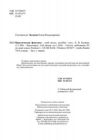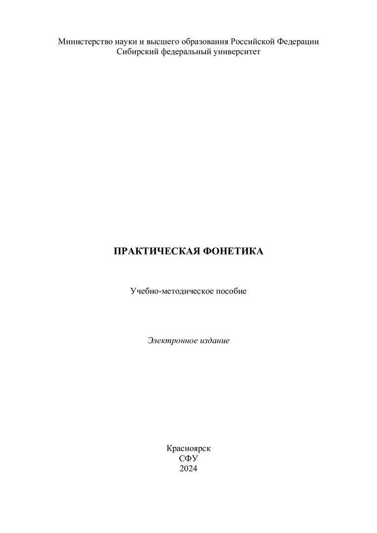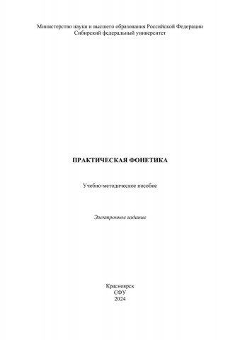 Библиографическое описание: Практическая фонетика : учебно-методическое пособие / Сибирский федеральный университет, Институт филологии и языковой коммуникации ; сост. Е. В. Беляева. - Электрон. текстовые дан. (pdf, 1,2 Мб). - Красноярск : СФУ, 2024 (2024-11-08). - 204 с. - Загл. с титул. экрана. - Изд. № 2024-23062 : Б. ц. - Текст : электронный.