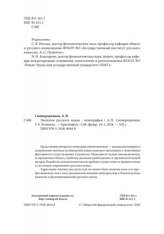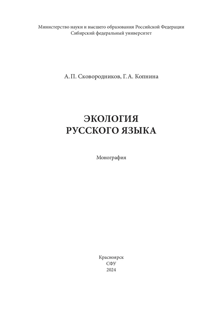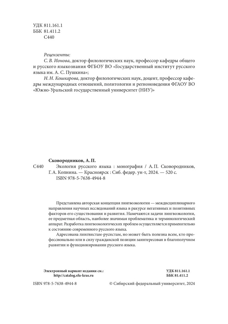 Библиографическое описание: Сковородников, Александр Петрович. Экология русского языка : монография / А. П. Сковородников, Г. А. Копнина ; рец.: С. В. Ионова, Н. Н. Кошкарова ; Сибирский федеральный университет, Институт филологии и языковой коммуникации. - Электрон. текстовые дан. (3,9 Мб). - Красноярск : СФУ, 2024 (2024-11-20). - 520 с., 32.5 усл. печ. л. : табл. - Загл. с титул. экрана. - Электрон. версия печ. публикации . - Библиогр.: с. 475-519. - 500 экз. - ISBN 978-5-7638-4944-8 : Б. ц. - Изд. № 2024-20951. - Текст : электронный.