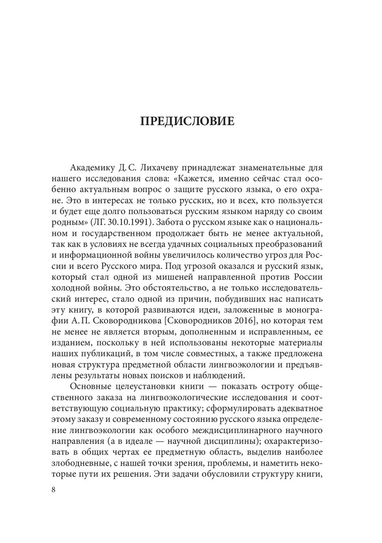Аннотация: Представлена авторская концепция лингвоэкологии — междисциплинарного направления научных исследований языка в ракурсе негативных и позитивных факторов его существования и развития. Намечаются задачи лингвоэкологии, ее предметная область, наиболее значимая проблематика и терминологический аппарат. Разработка лингвоэкологических проблем осуществляется применительно к состоянию современного русского языка. Адресована лингвистам-русистам, но может быть полезна всем, кто профессионально или в силу гражданской позиции заинтересован в благополучном развитии и функционировании русского языка.
