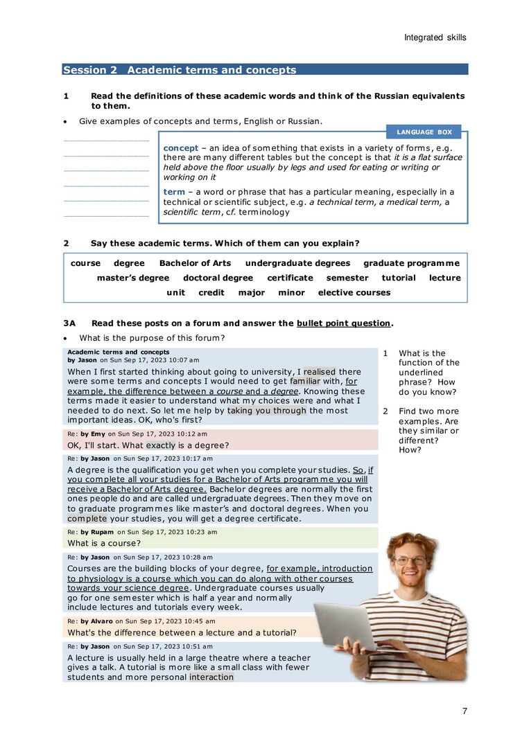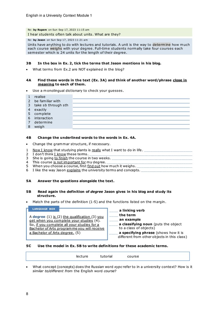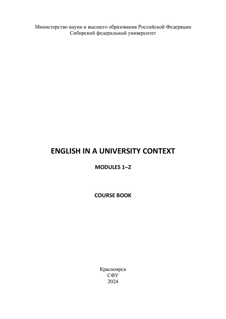 Библиографическое описание: English in a University Context. Modules 1-2. Course book. : учебное пособие / О. Л. Гроза, В. Е. Гусейнова, А. В. Антонюженко [и др.] ; рец.: О. В. Кузнецова, Е. С. Мучкина ; Сибирский федеральный университет, Институт фундаментальной биологии и биотехнологии. - Электрон. текстовые дан. (8,6 Мб). - Красноярск : СФУ, 2024. - 128 с. : цв. ил., табл. - Загл. с титул. экрана. - Электрон. версия печ. публикации . - 100 экз. - ISBN 978-5-7638-5037-6 : Б. ц. - Изд. № 2024-22176. - Текст : электронный.