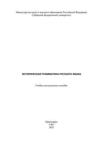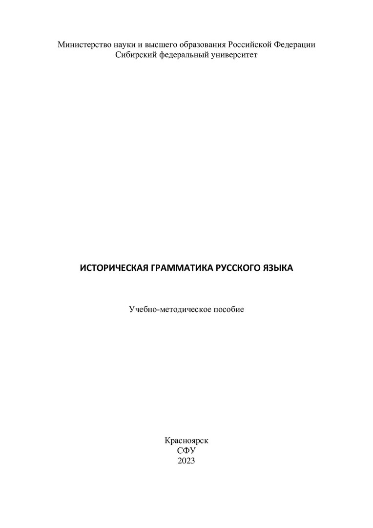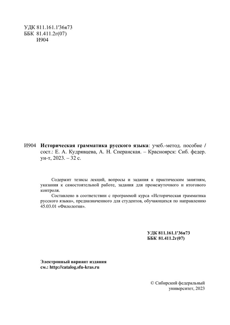 Библиографическое описание: Историческая грамматика русского языка : учебно-методическое пособие / Сибирский федеральный университет, Институт филологии и языковой коммуникации ; сост.: Е. А. Кудрявцева, А. Н. Сперанская. - Электрон. текстовые дан. (1,2 Мб). - Красноярск : СФУ, 2023 (2023-10-16). - 32 с. - Загл. с титул. экрана. - Электрон. версия печ. публикации . - Библиогр.: с. 30-31. - 100 экз. - Изд. № 2023-19960 : Б. ц. - Текст : электронный.
