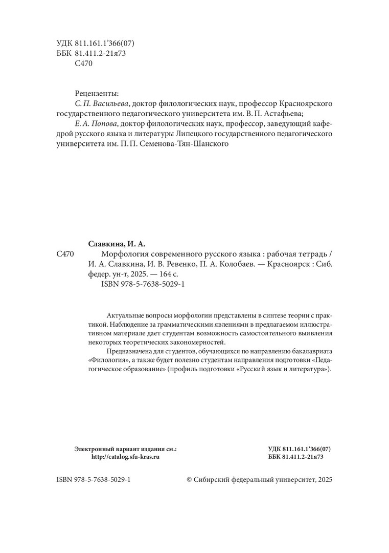 Библиографическое описание: Славкина, Инга Анатольевна. Морфология современного русского языка : рабочая тетрадь / И. А. Славкина, И. В. Ревенко, П. А. Колобаев ; рец.: С. П. Васильева, Е. А. Попова ; Сибирский федеральный университет, Институт филологии и языковой коммуникации. - Электрон. текстовые дан. (pdf, 2.1 Мб). - Красноярск : СФУ, 2025 (2025-08-14). - 164 с., 10.3 усл. печ. л. : табл. - Загл. с титул. экрана. - Электрон. версия печ. публикации . - Библиогр.: с. 156-162. - 100 экз. - ISBN 978-5-7638-5029-1 : Б. ц. - Изд. № 2024-22458. - Текст : электронный.