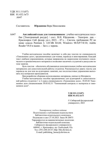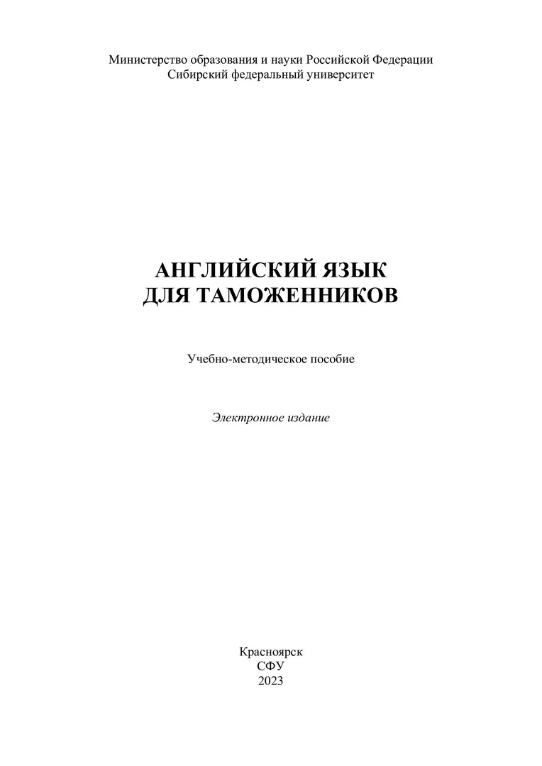 Библиографическое описание: Английский язык для таможенников : учебно-методическое пособие / Сиб. федер. ун-т, Ин-т торговли и сферы услуг ; сост. В. Н. Юрданова. - Электрон. текстовые дан. (pdf, 1,5 Мб). - Красноярск : СФУ, 2023 (2023-10-27). - 87 с. - Загл. с титул. экрана. - Изд. № 2023-20075 : Б. ц. - Текст : электронный.