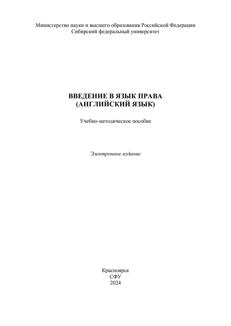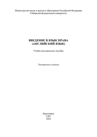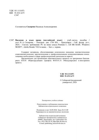 Библиографическое описание:Введение в язык права (английский язык) : учебно-методическое пособие / Сиб. федер. ун-т, Ин-т филологии и яз. коммуникации ; сост. Н. А. Сидорова. - Электрон. текстовые дан. (pdf, 0,7 Мб). - Красноярск : СФУ, 2024 (2024-09-24). - 49 с. - Загл. с титул. экрана. - Изд. № 2024-21149 : Б. ц. - Текст : электронный.