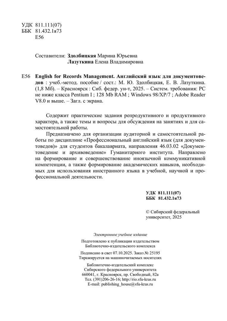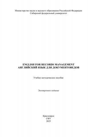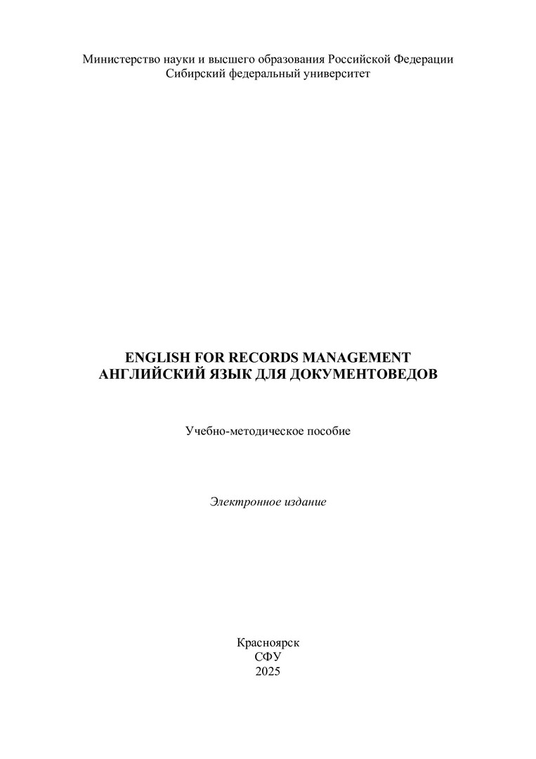 Библиографическое описание: English for Records Management = Английский язык для документоведов : учебно-методическое пособие / Сибирский федеральный университет, Институт филологии и языковой коммуникации ; сост.: М. Ю. Здолбицкая, Е. В. Лазуткина. - Электрон. текстовые дан. (pdf, 3.9 Мб). - Красноярск : СФУ, 2025 (2025-10-07). - 52 с. - Загл. с титул. экрана. - Изд. № 2025-25195 : Б. ц. - Текст : электронный.