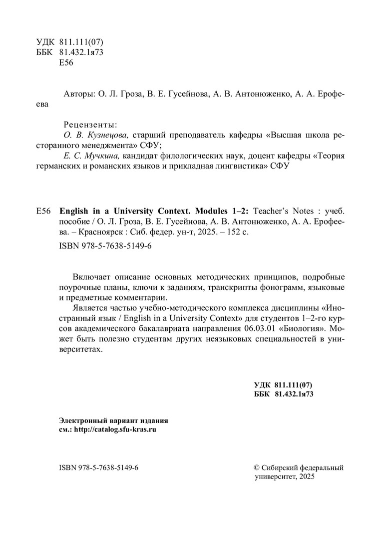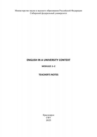 Библиографическое описание: English in a University Context. Modules 1-2. Teacher's Notes : учебное пособие / О. Л. Гроза, В. Е. Гусейнова, А. В. Антонюженко, А. А. Ерофеева ; рец.: О. В. Кузнецова, Е. С. Мучкина ; Сибирский федеральный университет, Институт фундаментальной биологии и биотехнологии. - Электрон. текстовые дан. (pdf, 3.7 Мб). - Красноярск : СФУ, 2025 (2025-08-05). - 152 с. : табл. - Загл. с титул. экрана. - Электрон. версия печ. публикации . - 100 экз. - ISBN 978-5-7638-5149-6 : Б. ц. - Изд. № 2025-24811. - Текст : электронный.