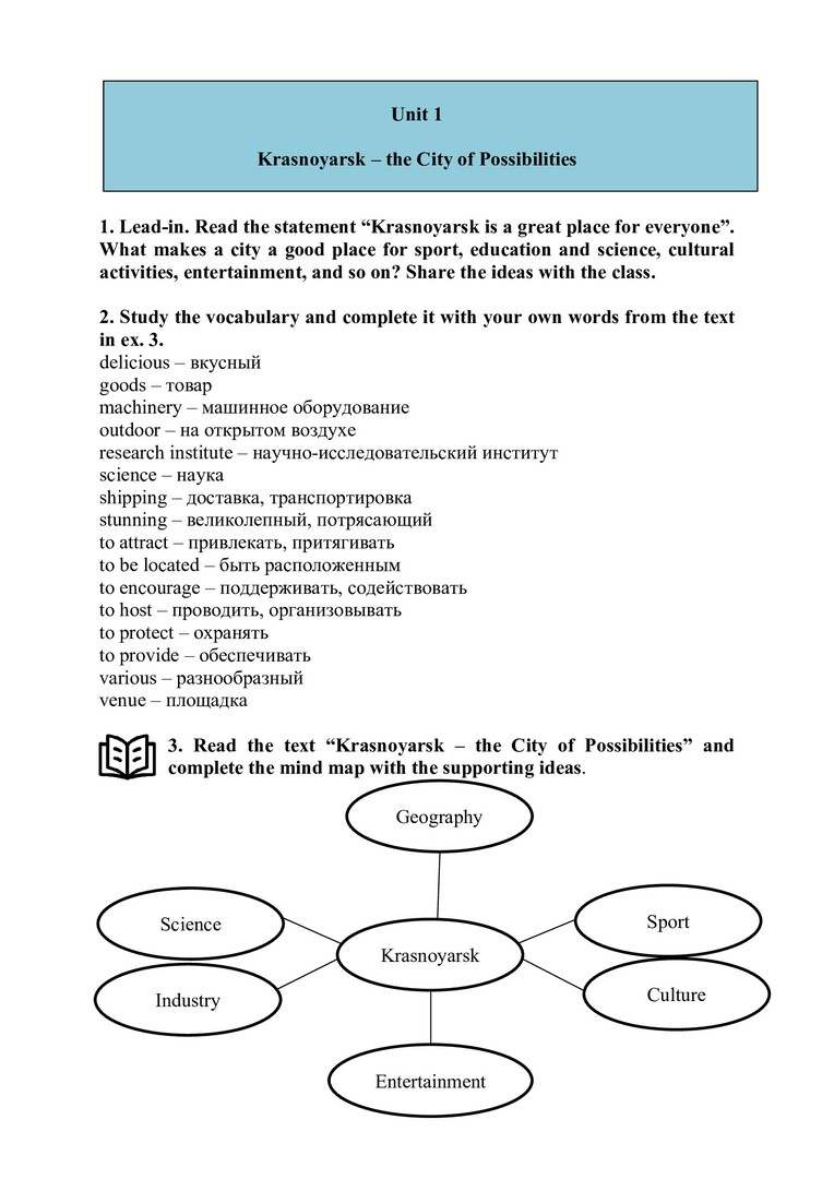 Аннотация: Учебно-методическое пособие «English for Construction» предназначено для ауди-торной и самостоятельной работы студентов 1-2 курсов бакалавриата и специалитета, обучающихся по направлениям: 08.03.01 «Строительство»; 08.05.01 «Строительство уни-кальных зданий и сооружений»; 20.03.02 «Природообустройство и водопользование».Целью пособия является развитие иноязычной компетенции в ситуациях, связан-ных с профессиональной и академической коммуникацией. Достижение цели осуществ-ляется через погружение в соответствующий контекст. Пособие содержит 4 раздела, по-строенных по единому принципу: «Krasnoyarsk –the City of Possibilities», «Construction in Siberia», «Civil Engineering», «School of engineering and construction». Задания разделов направлены на развитие всех видов речевой деятельности –аудирование, говорение, чте-ние, письмо. Каждый раздел содержит задания, способствующие вовлечению в тему, изу-чению и запоминанию тематического вокабуляра, обучению работе с текстом как видом письменной речи и построению высказываний. Пособие основано на современных оригинальных текстах, представляющих прак-тический и познавательный интерес для обучающихся строительных специальностей