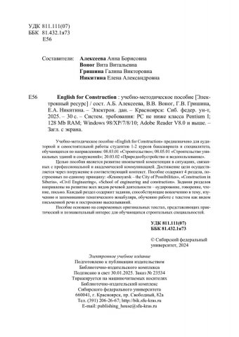 Библиографическое описание: English for Construction : учебно-методическое пособие / Сиб. федер. ун-т, Ин-т филологии и яз. коммуникации ; сост. А. Б. Алексеева [и др.]. - Электрон. текстовые дан. (pdf, 1,1 Мб). - Красноярск : СФУ, 2025 (2025-01-30). - 30 с. - Загл. с титул. экрана. - Изд. № 2024-23534 : Б. ц. - Текст : электронный.