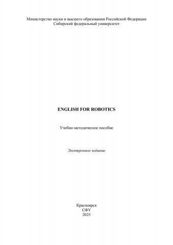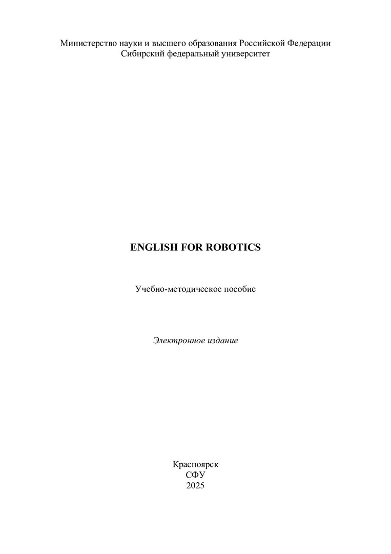 Библиографическое описание: English For Robotics : учебно-методическое пособие / Сибирский федеральный университет, Институт филологии и языковой коммуникации ; сост.: И. В. Алексеенко, В. М. Антолиновская, Е. В. Герасименко, С. В. Кокорина. - Электрон. текстовые дан. (pdf, 17,4 Мб). - Красноярск : СФУ, 2025 (2025-01-27). - 107 с. - Загл. с титул. экрана. - Изд. № 2024-23469 : Б. ц. - Текст : электронный.