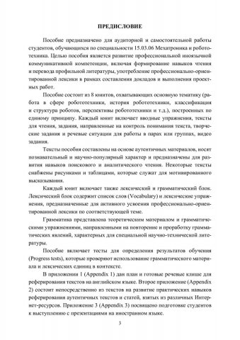 Аннотация: Сдержит учебный материал, способствующий развитию профессиональной иноязычной коммуникативной компетенции, включая формирование навыков чтения и перевода профильной литературы, употребление профессионально-ориентированной лексики в рамках составления докладов и выполнения проектных работ. Тексты учебного пособия составлены на основе аутентичных материалов, источниками которых является Интернет. Предназначено для студентов направления 15.03.06 «Мехатроника и робототехника».
