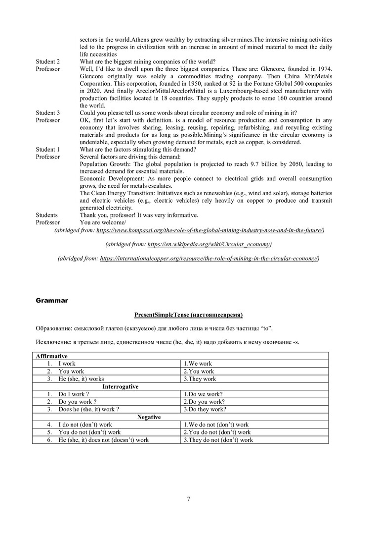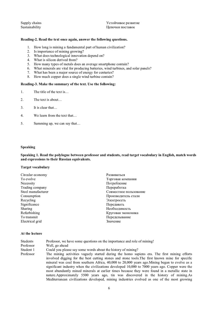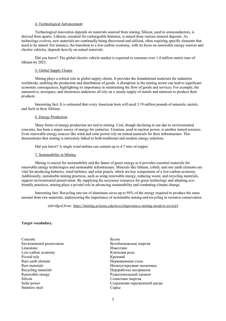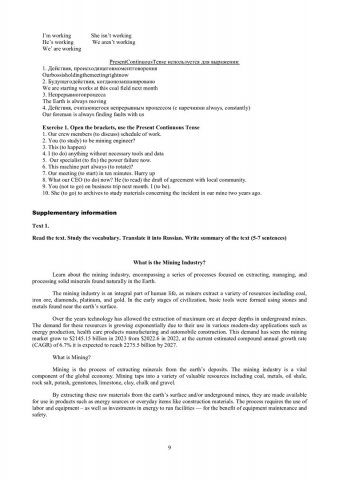 Аннотация: Учебно-методическое издание состоит из 7 разделов, тематическое содержание которых направлено на изучение влияния горных разработок на окружающую среду и способов сокращения их негативных последствий. Структура разделов соответствует заявленной теме: the role of mining in the world; basic mining methods; waste disposal; the negative impact on the environment; reclamation; health hazards; the future of mining. Каждый раздел содержит аутентичный текстовый материал, терминологический глоссарий с переводом, упражнения на отработку соответствующих грамматических конструкций (grammar) и речевых навыков профессиональной коммуникации (speaking). Дополнительные тексты для самостоятельного чтения и отработки (supplementary information) могут быть использованы для подготовки презентаций на экологическую тематику.