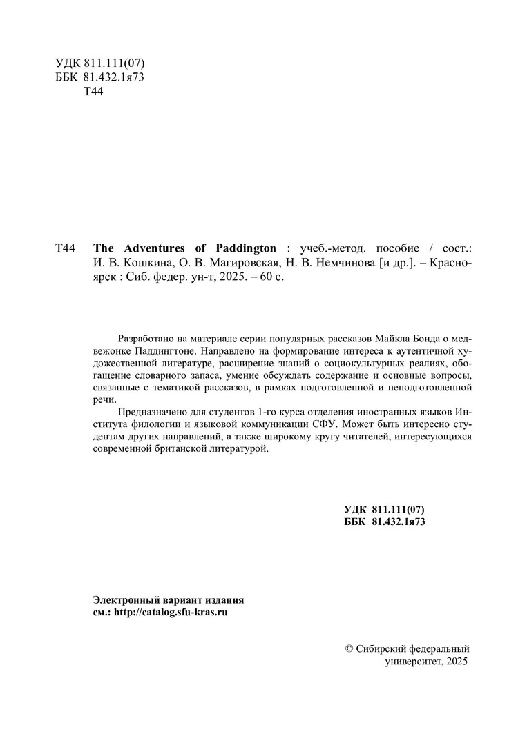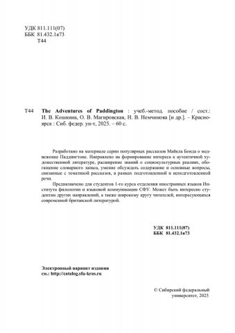 Библиографическое описание: The Adventures of Paddington : учебно-методическое пособие / Сибирский федеральный университет, Институт филологии и языковой коммуникации ; сост.: И. В. Кошкина, О. В. Магировская, Н. В. Немчинова [и др.]. - Электрон. текстовые дан. (pdf, 3.4 Мб). - Красноярск : СФУ, 2025 (2025-09-24). - 60 с. : табл. - Загл. с титул. экрана. - Электрон. версия печ. публикации . - 100 экз. - Изд. № 2025-25174 : Б. ц. - Текст : электронный.