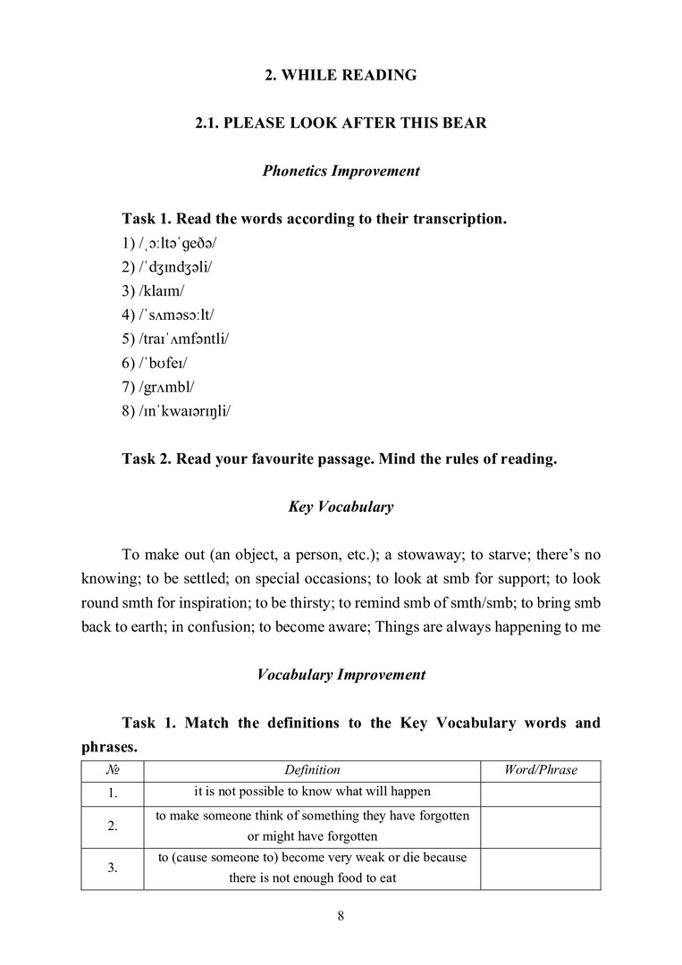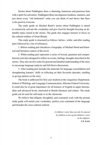 Аннотация: Разработано на материале серии популярных рассказов Майкла Бонда о медвежонке Паддингтоне. Направлено на формирование интереса к аутентичной художественной литературе, расширение знаний о социокультурных реалиях, обогащение словарного запаса, умение обсуждать содержание и основные вопросы, связанные с тематикой рассказов, в рамках подготовленной и неподготовленной речи. Предназначено для студентов 1-го курса отделения иностранных языков Института филологии и языковой коммуникации СФУ. Может быть интересно студентам других направлений, а также широкому кругу читателей, интересующихся современной британской литературой.