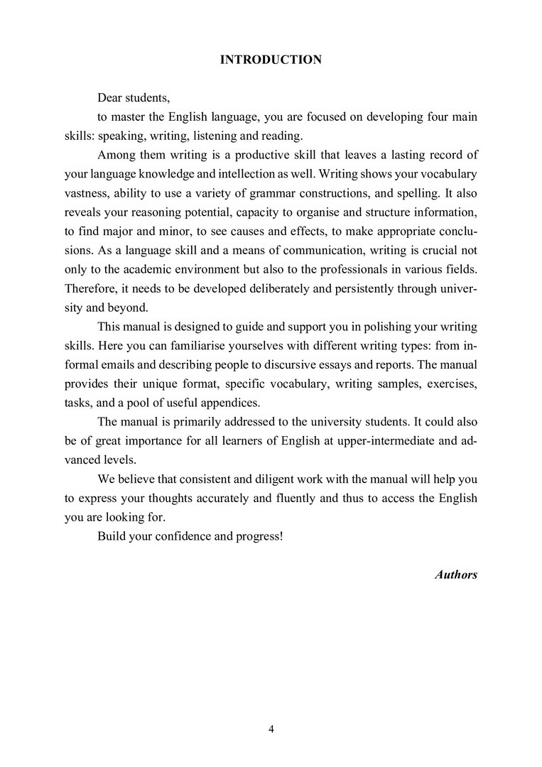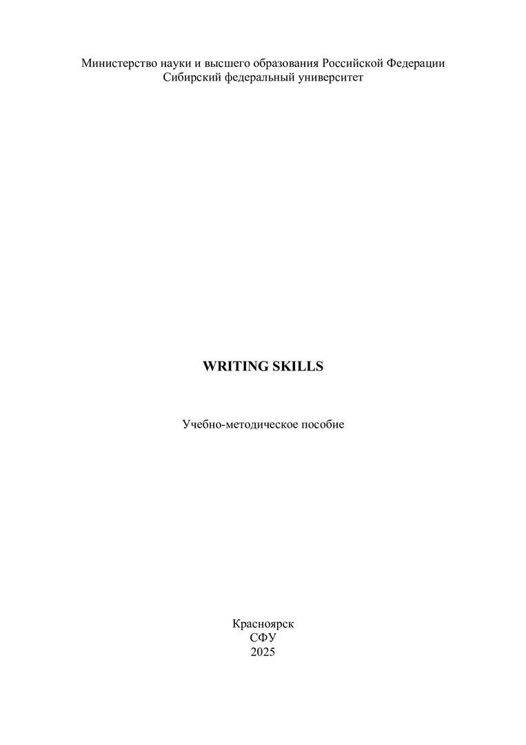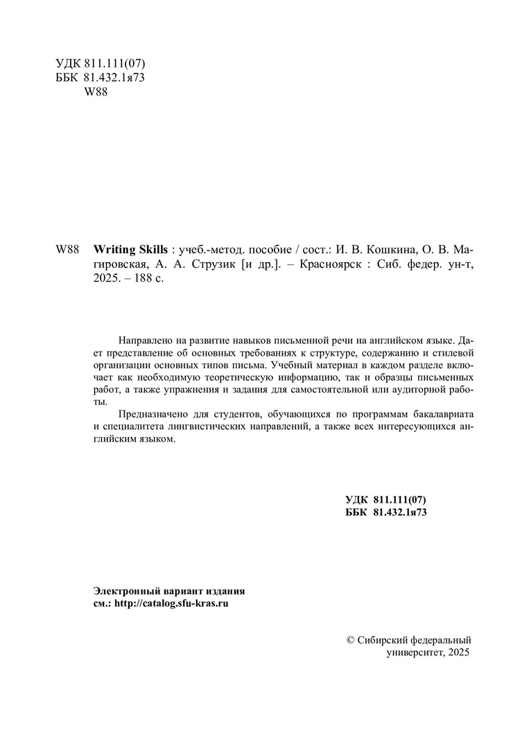 Библиографическое описание: Writing Skills : учебно-методическое пособие / Сибирский федеральный университет, Институт филологии и языковой коммуникации ; :сост. И. В. Кошкина, О. В. Магировская, А. А. Струзик [и др.]. - Электрон. текстовые дан. (pdf, 6.4 Мб). - Красноярск : СФУ, 2025 (2025-09-24). - 188 с. : граф., табл. - Загл. с титул. экрана. - Электрон. версия печ. публикации . - 100 экз. - Изд. № 2025-25175 : Б. ц. - Текст : электронный.