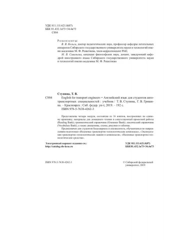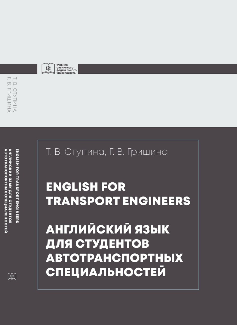 Библиографическое описание:Ступина, Татьяна Владимировна. Английский язык для студентов автотранспортных специальностей. English for transport engineers. : учебник для студентов, обучающихся по направлениям подготовки "Наземные транспортно-технологические комплексы", "Эксплуатация транспортно-технологических машин и комплексов", "Наземные транспортно-технологические средства" / Т. В. Ступина, Г. В. Гришина ; Сиб. федер. ун-т, Ин-т филологии и яз. коммуникации. - Красноярск : СФУ, 2019 (2020-01-18). - 191 с. - Библиогр.: с. 191. - 500 экз. - ISBN 978-5-7638-4262-3 : 470.00 р. - Изд. № 2019-10444. - Текст : непосредственный + Текст : электронный.