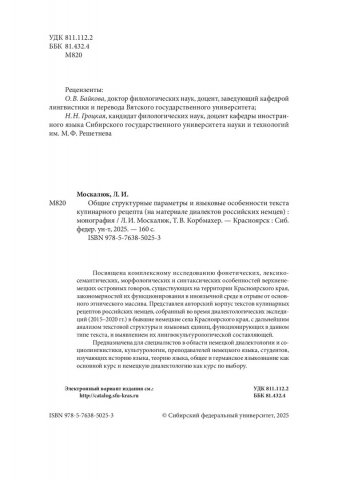 Библиографическое описание: Москалюк, Лариса Ивановна. Общие структурные параметры и языковые особенности текста кулинарного рецепта (на материале диалектов российских немцев) : монография / Л. И. Москалюк, Т. В. Корбмахер ; рец.: О. В. Байкова, Н. Н. Гроцкая ; Сибирский федеральный университет, Институт торговли и сферы услуг. - Электрон. текстовые дан. (pdf, 6.5 Мб). - Красноярск : СФУ, 2025 (2025-09-15). - 160 с., 10.0 усл. печ. л. : табл., цв. ил. - Загл. с титул. экрана. - Электрон. версия печ. публикации . - Библиогр.: с. 128-146. - 500 экз. - ISBN 978-5-7638-5025-3 : Б. ц. - Изд. № 2024-22270. - Текст : электронный.