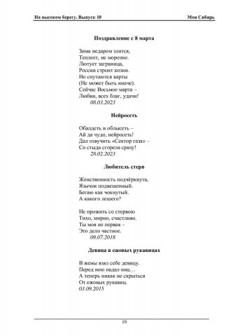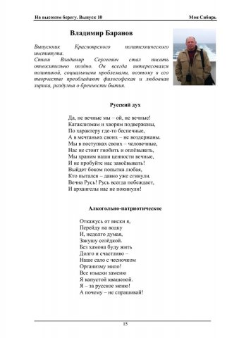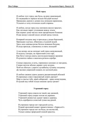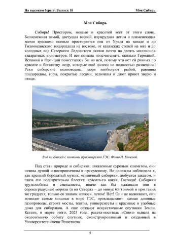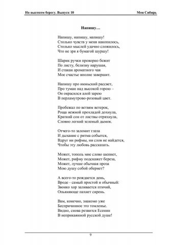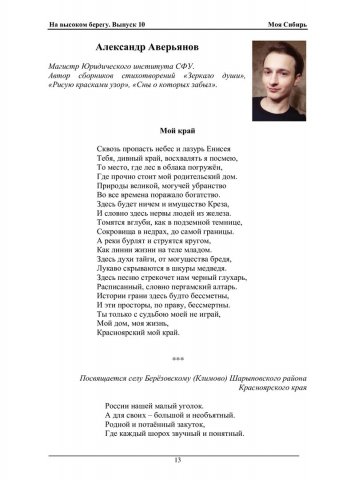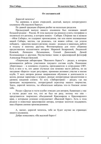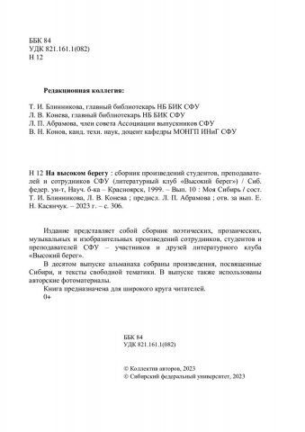 Библиографическое описание:На высоком берегу : сборник произведений студентов, преподавателей и сотрудников СФУ (литературный клуб "Высокий Берег") / Сибирский федеральный университет. - Красноярск : СФУ, 1999 - . - Текст : непосредственный. + Текст : электронный. Вып. 10 : Моя Сибирь / [сост.: Т. И. Блинникова, Л. В. Конева ; предисл. Л. П. Абрамовой ; отв. за вып. Е. Н. Касянчук]. - 2023. - 306 с. : ил., фот. авт. - : 284.58 р., 665.00 р.