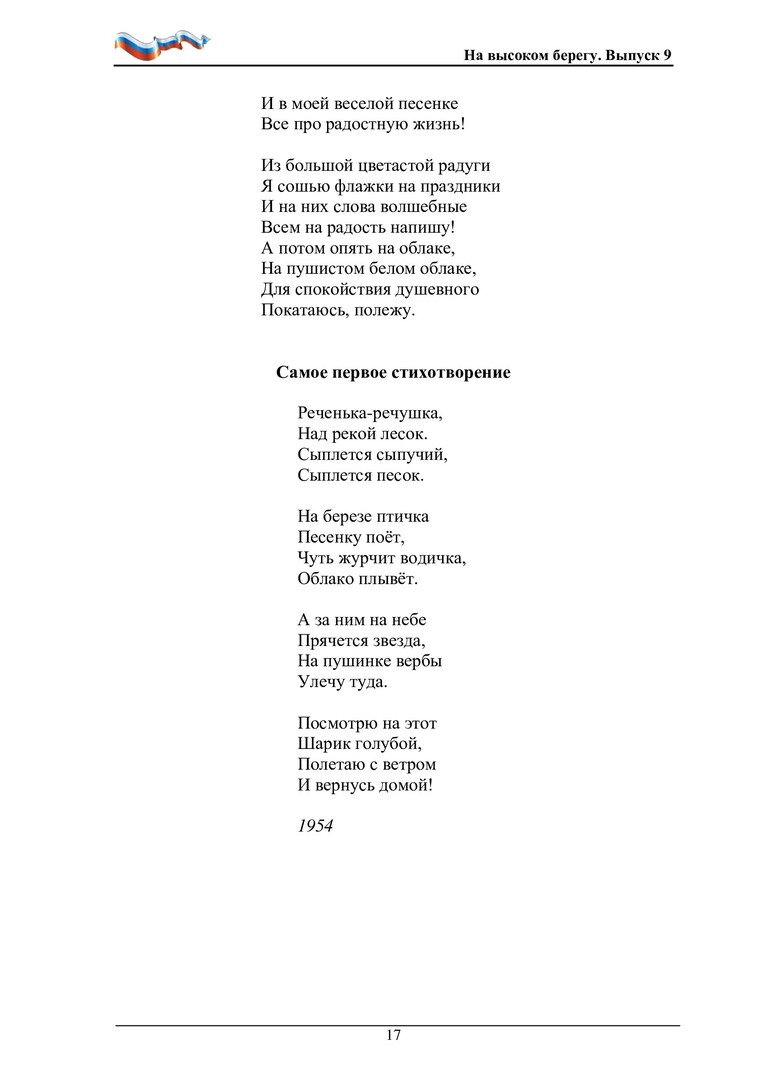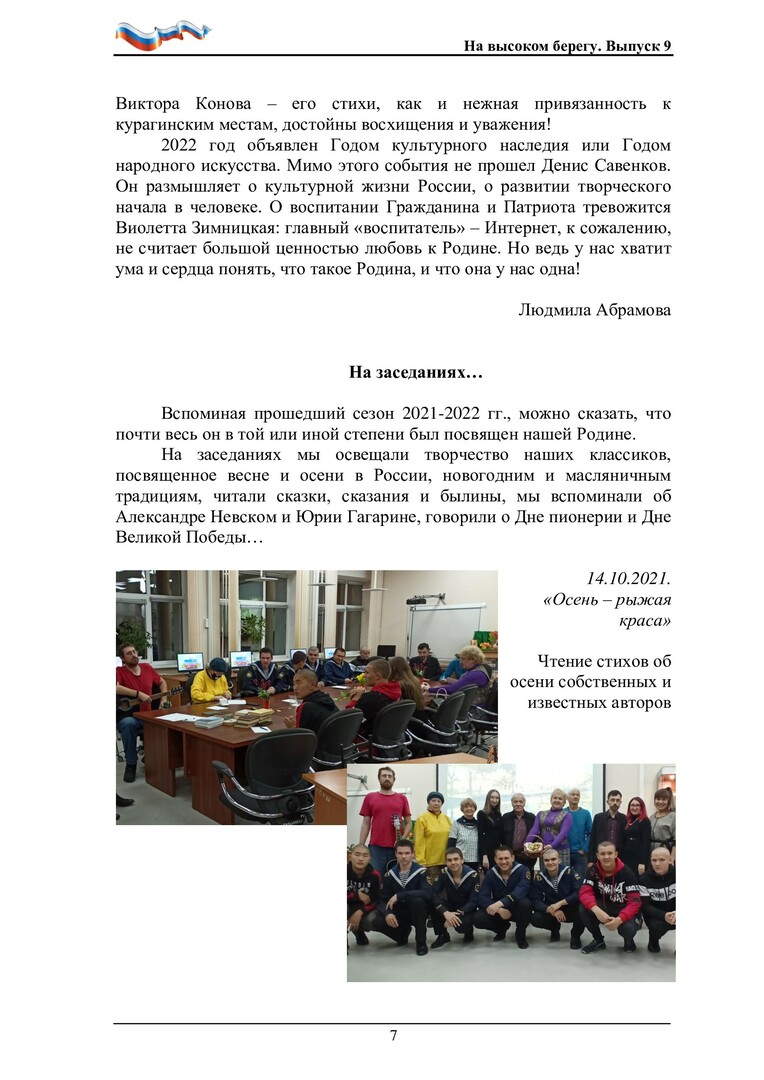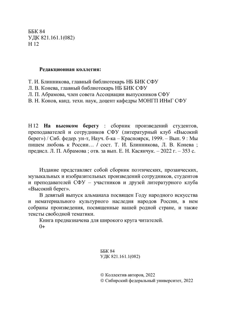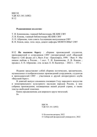 Библиографическое описание:На высоком берегу : сборник произведений студентов, преподавателей и сотрудников СФУ (литературный клуб "Высокий Берег") / Сибирский федеральный университет. - Красноярск : СФУ, 1999 - . - Текст : непосредственный. + Текст : электронный. Вып. 9 : Мы пишем любовь к России... / [сост.: Т. И. Блинникова, Л. В. Конева ; предисл. Л. П. Абрамовой ; отв. за вып. Е. Н. Касянчук]. - 2022. - 353 с. : ил., фот. авт. - : 328.29 р.