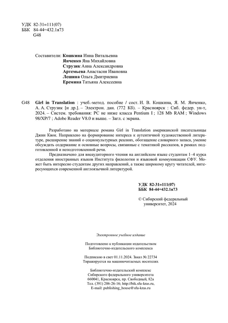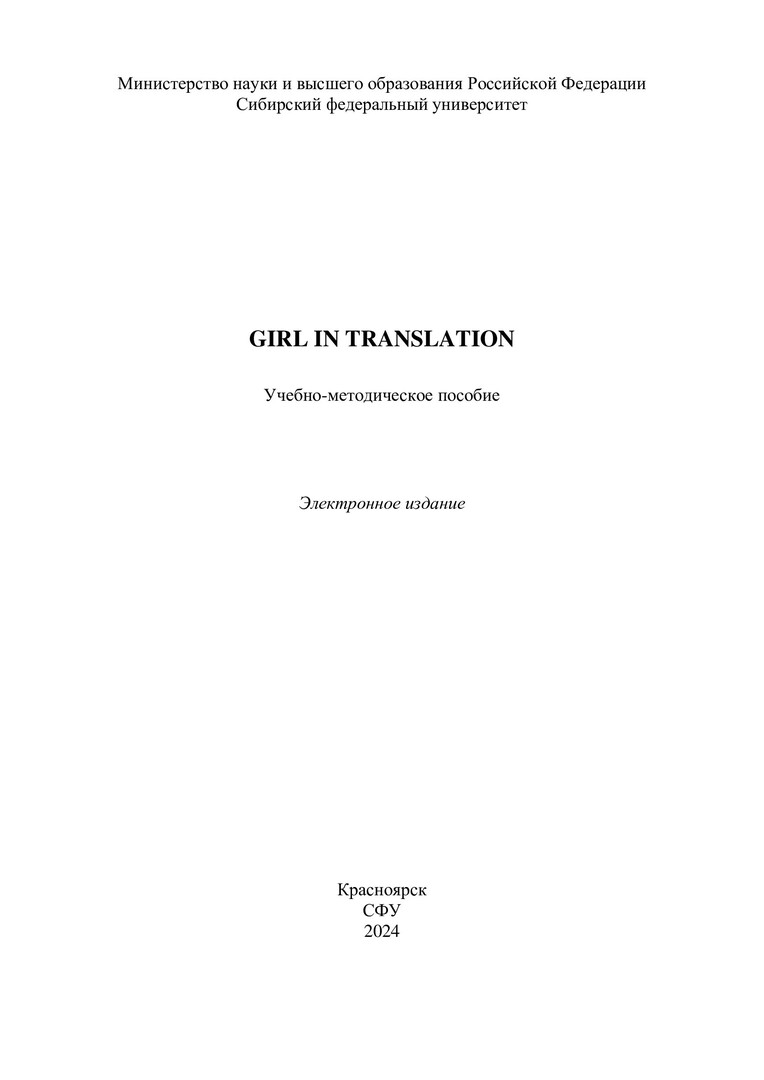 Библиографическое описание: Girl in Translation : учебно-методическое пособие / Сибирский федеральный университет, Институт филологии и языковой коммуникации ; сост. И. В. Кошкина, Я. М. Янченко, А. А. Струзик [и др.]. - Электрон. текстовые дан. (pdf, 0,8 Мб). - Красноярск : СФУ, 2024 (2024-11-01). - 69 с. - Загл. с титул. экрана. - Изд. № 2024-22734 : Б. ц. - Текст : электронный.
