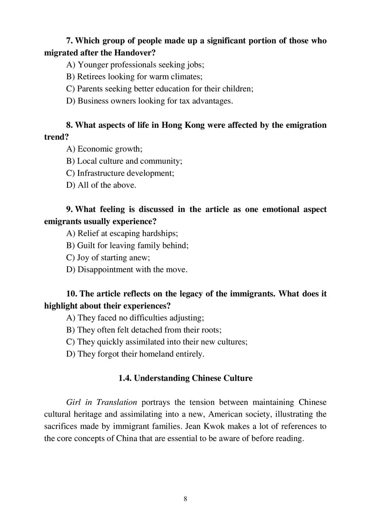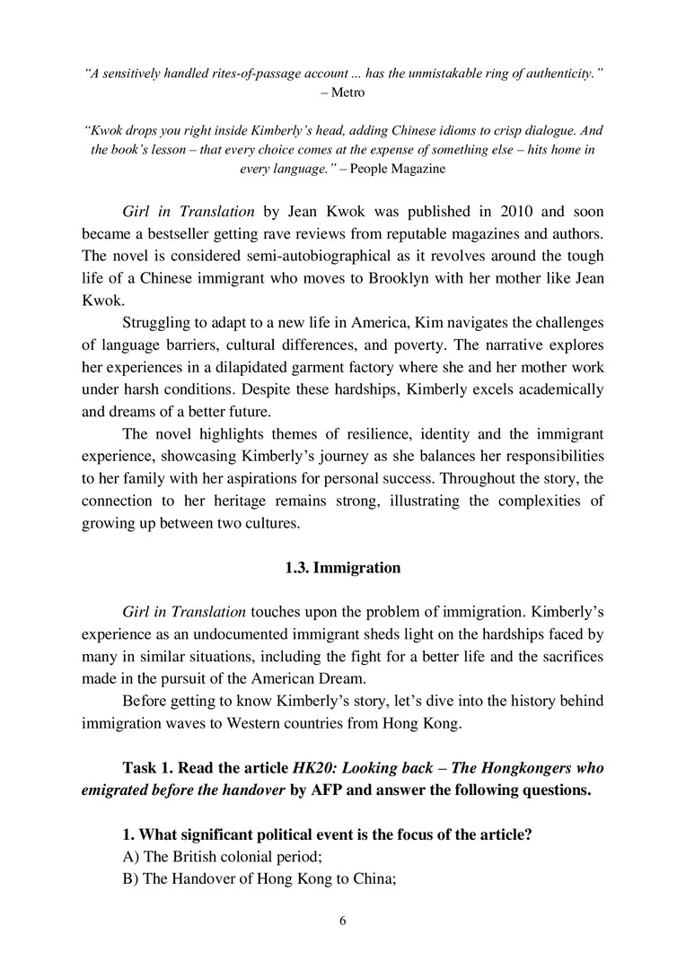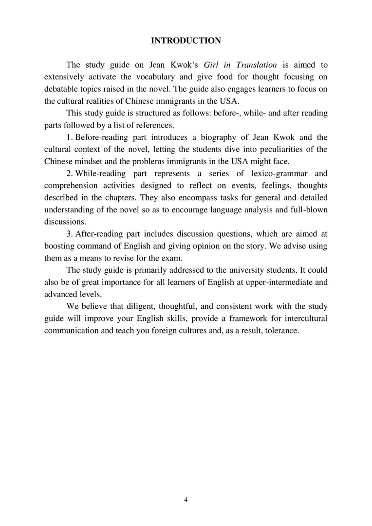 Аннотация: Разработано на материале романа Girl in Translation американской писательницы Джин Квок. Направлено на формирование интереса к аутентичной художественной литературе, расширение знаний о социокультурных реалиях, обогащение словарного запаса, умение обсуждать содержание и основные вопросы, связанные с тематикой рассказов, в рамках подготовленной и неподготовленной речи. Предназначено для внеаудиторного чтения на английском языке студентам 1–4 курса отделения иностранных языков Института филологии и языковой коммуникации СФУ. Может быть интересно студентам других направлений, а также широкому кругу читателей, интересующихся современной англоязычной литературой.