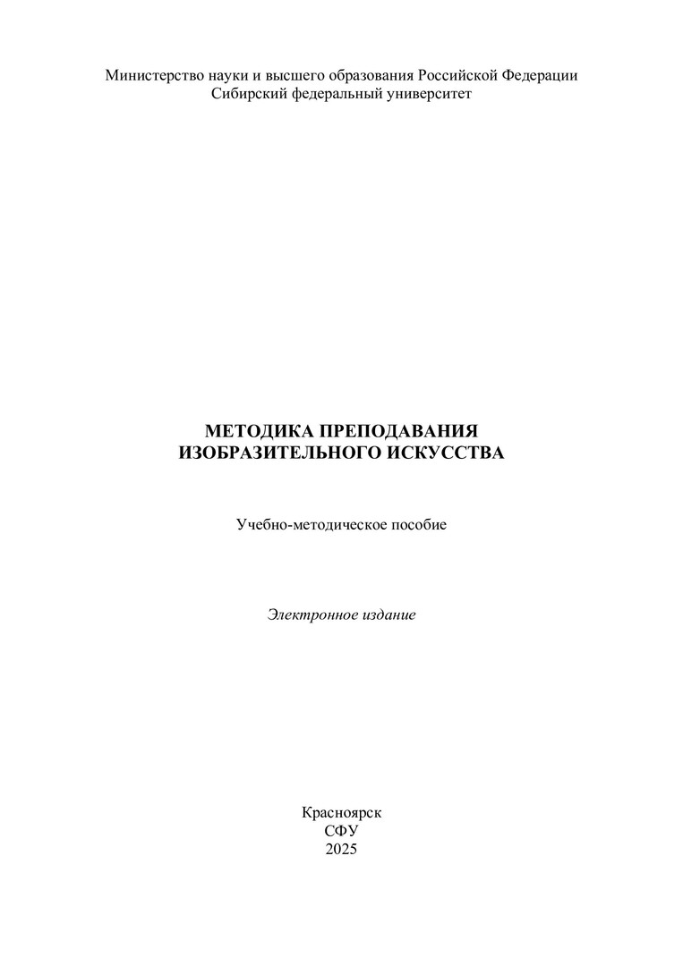Библиографическое описание: Методика преподавания изобразительного искусства : учебно-методическое пособие / Сибирский федеральный университет, Институт архитектуры и дизайна ; сост.: Т. Ю. Серикова,Т. К. Симанженкова, Н. А. Незговорова, В. Л. Тюканова. - Электрон. текстовые дан. (pdf, 28 Мб). - Красноярск : СФУ, 2025 (2025-05-12). - 166 с. - Загл. с титул. экрана. - Библиогр.: с. 156-161. - Изд. № 2025-23055 : Б. ц. - Текст : электронный.
