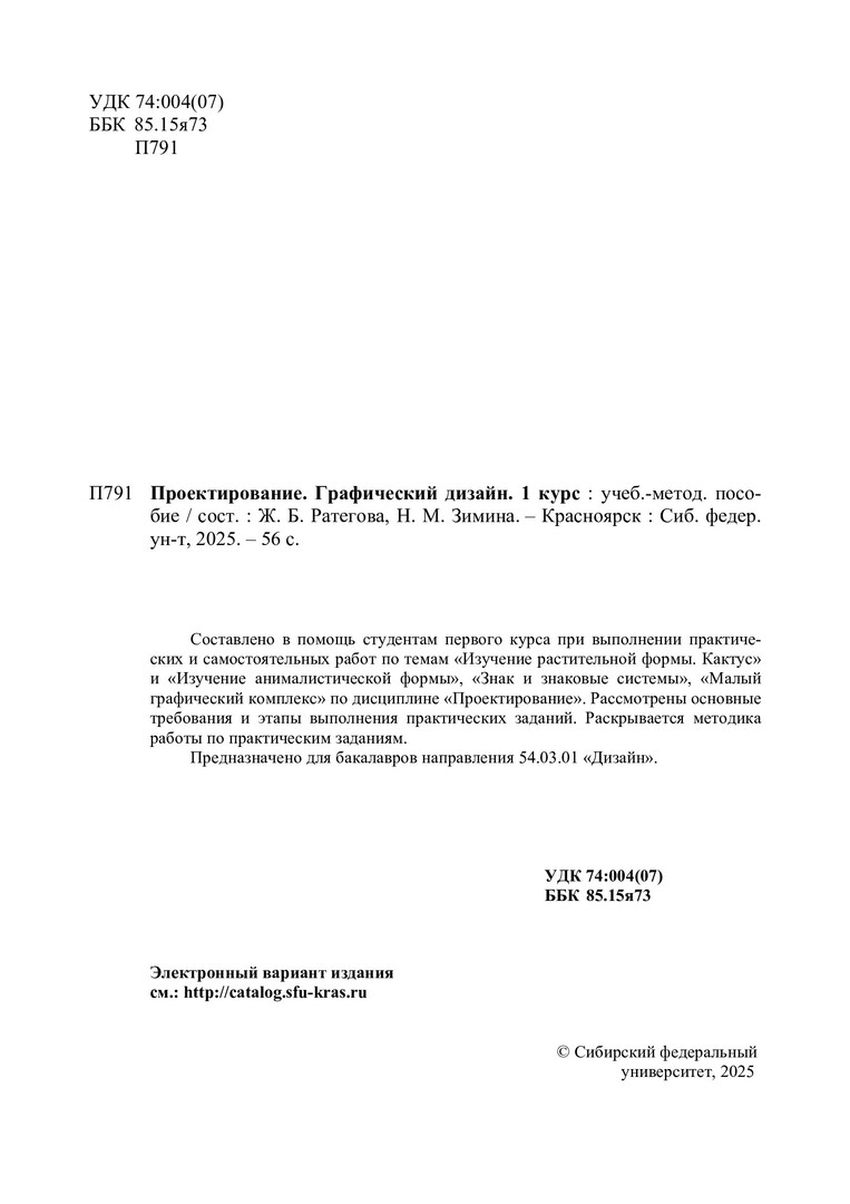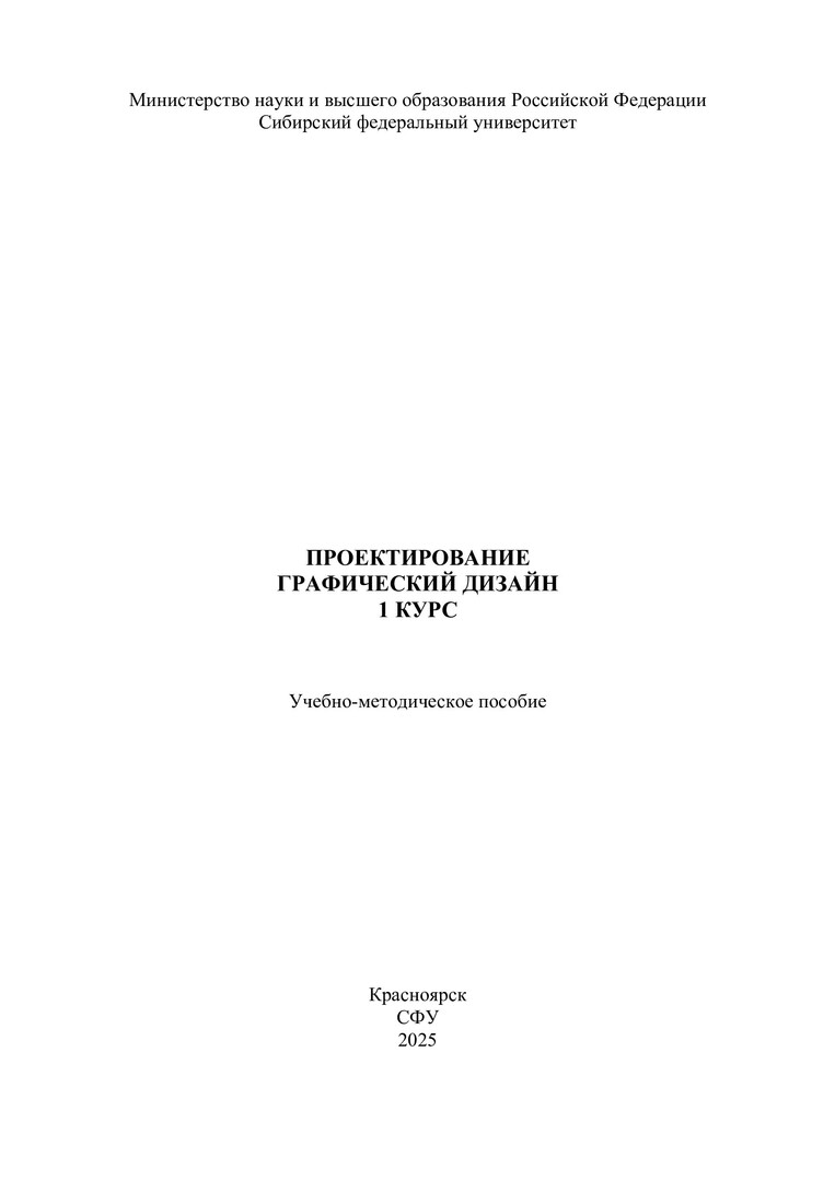 Библиографическое описание: Проектирование. Графический дизайн. 1 курс : учебно-методическое пособие / Сибирский федеральный университет, Институт архитектуры и дизайна ; сост.: Ж. Б. Ратегова, Н. М. Зимина. - Электрон. текстовые дан. (pdf ; 14,1 Мб). - Красноярск : СФУ, 2025 (2025-05-05). - 56 с. : ил., цв. ил. - Загл. с титул. экрана. - Электрон. версия печ. публикации . - Библиогр.: с. 53-54. - 100 экз. - Изд. № 2025-24050 : Б. ц. - Текст : электронный.