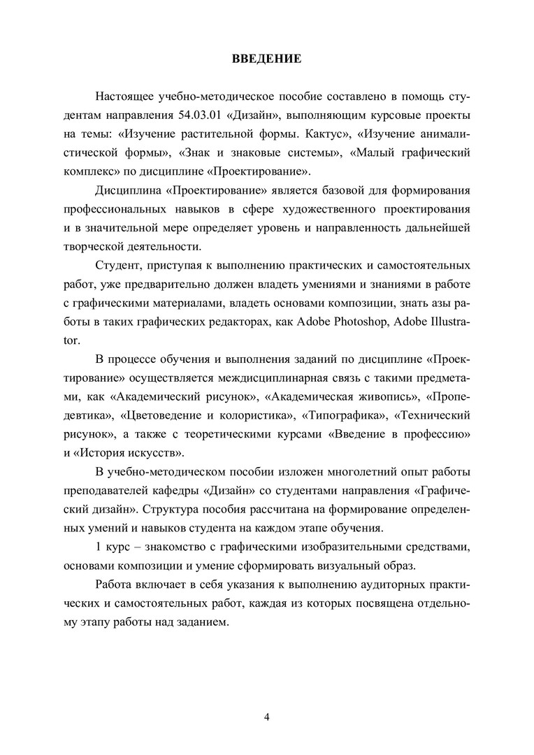 Аннотация: Составлено в помощь студентам первого курса при выполнении практических и самостоятельных работ по темам «Изучение растительной формы. Кактус» и «Изучение анималистической формы», «Знак и знаковые системы», «Малый графический комплекс» по дисциплине «Проектирование». Рассмотрены основные требования и этапы выполнения практических заданий. Раскрывается методика работы по практическим заданиям. Предназначено для бакалавров направления 54.03.01 «Дизайн».
