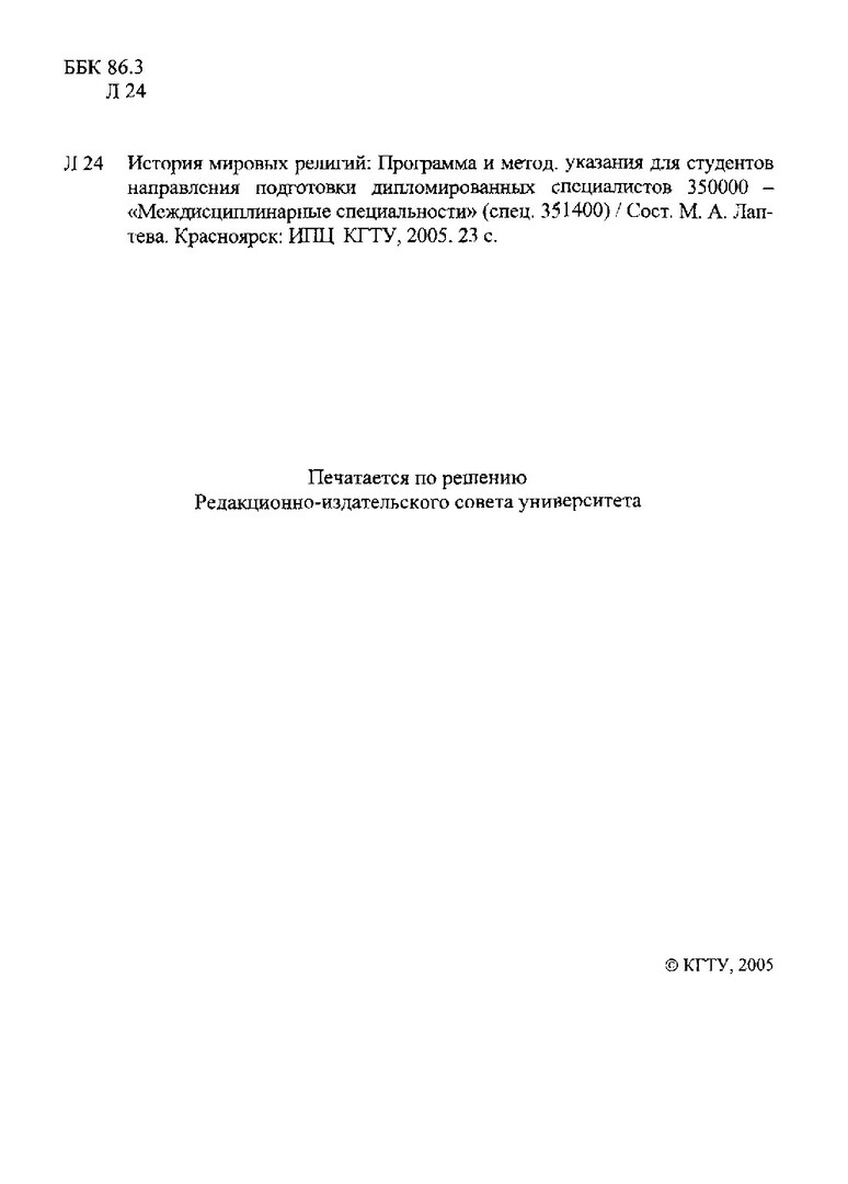 Библиографическое описание:Лаптева, Марина Анатольевна. История мировых религий : программа и метод. указ. для студентов направления подгот. дипломир. спец. 350000 / М. А. Лаптева ; Краснояр. гос. техн. ун-т. - Электрон. текстовые дан. (700 Кб). - Красноярск : ИПЦ КГТУ, 2005. - (Учебно-методическая литература). - Загл. с титул. экрана. - Электрон. версия печ. публикации . - Текст : электронный.