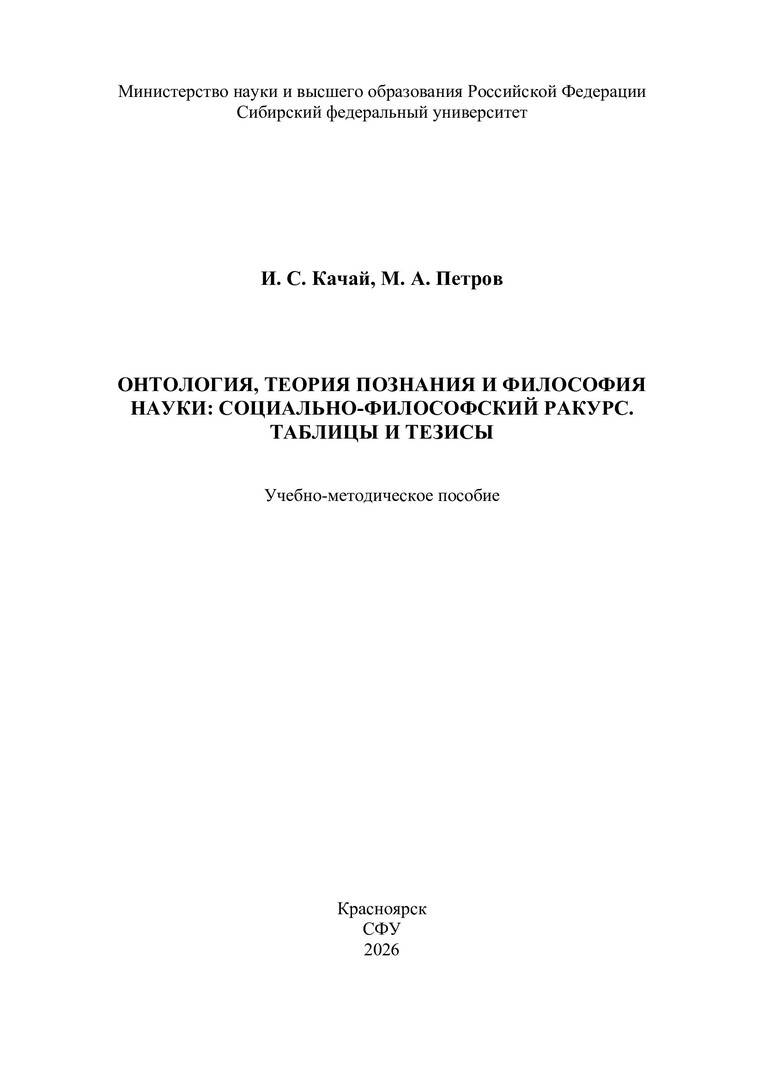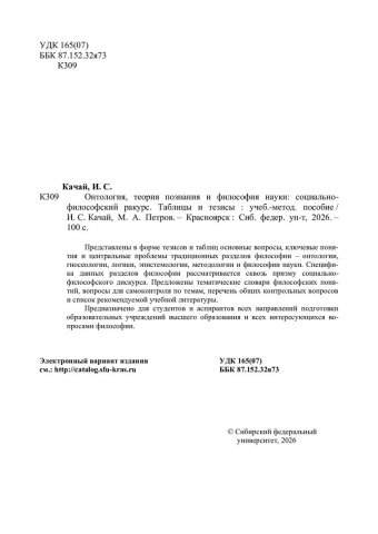 Библиографическое описание:Качай, Илья Сергеевич. Онтология, теория познания и философия науки: социально-философский ракурс. Таблицы и тезисы : учебно-методическое пособие / И. С. Качай, М. А. Петров ; Сибирский федеральный университет. - Электрон. текстовые дан. (pdf, 2.5 Мб). - Красноярск : СФУ, 2026 (2026-02-02). - 100 с., 5.0 усл. печ. л. - Загл. с титул. экрана. - Библиогр.: с. 96-97. - 100 экз. - Изд. № 2026-25940 : Б. ц. - Текст : электронный.