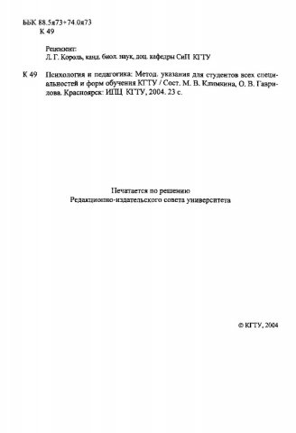 Библиографическое описание:Климкина, Марина Викторовна. Психология и педагогика : метод. указ. для студентов всех спец. и форм обучения КГТУ / М. В. Климкина, О. В. Гаврилова ; Краснояр. гос. техн. ун-т. - Красноярск : ИПЦ КГТУ, 2004. - 23 с. - Библиогр.: с. 19-22. - Текст : непосредственный + Текст : электронный.
