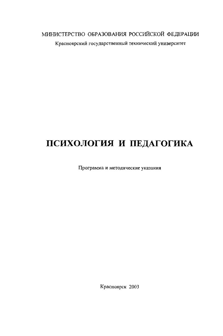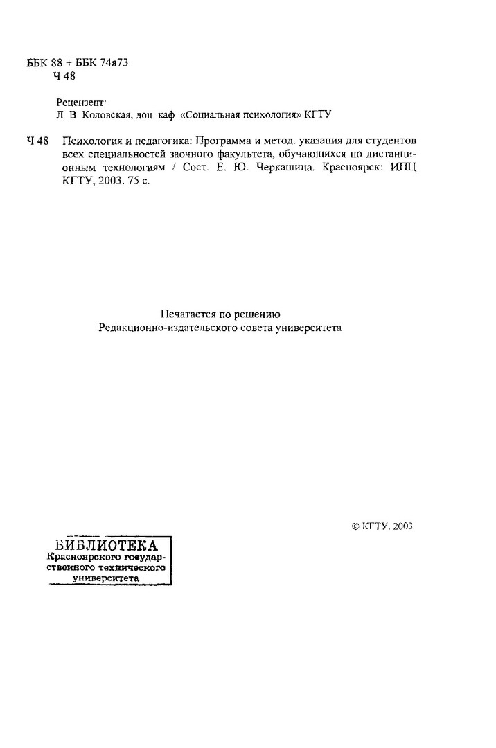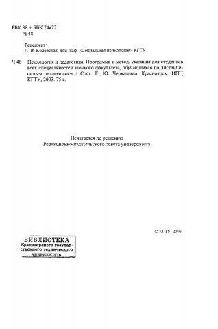 Библиографическое описание:Черкашина, Елена Юрьевна. Психология и педагогика : Программа и метод. указ. для студ. всех спец. заоч. фак., обуч. по дистанцион. технологиям / Краснояр. гос. техн. ун-т ; Е.Ю. Черкашина. - Красноярск : ИПЦ КГТУ, 2003. - 75 с. - (Система открытого образования). - Текст : непосредственный + Текст : электронный.