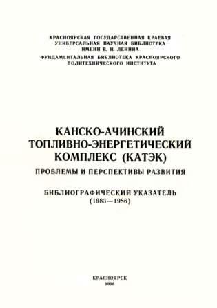 Библиографическое описание:Канско-Ачинский топливно-энергетический комплекс (КАТЭК). Проблемы и перспективы развития : библиографический указатель (1983-1986) / Красноярская государственная краевая универсальная научная библиотека им. В. И. Ленина, Фундаментальная библиотека Красноярского политехнического института (Красноярск) ; [сост. В. Ф. Безденежная [и др.] ; науч. ред. М. Н. Ларионов]. - Красноярск : Б. и., 1988. - 151 с. - Имен. указ.: с. 129-149. - 0.0. - Текст : непосредственный.