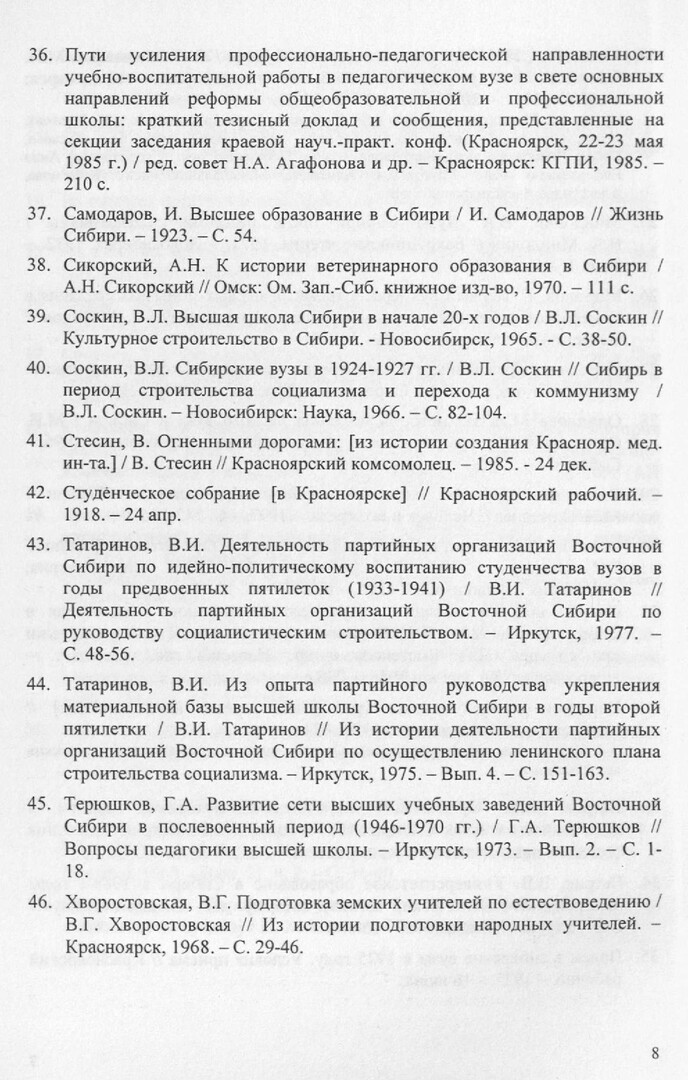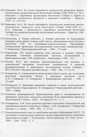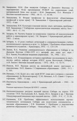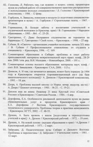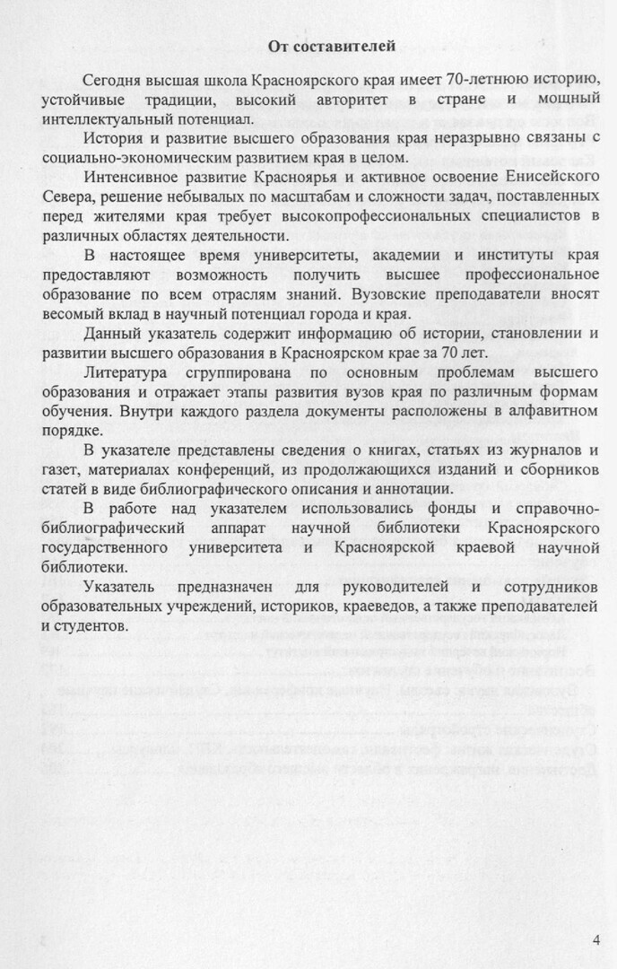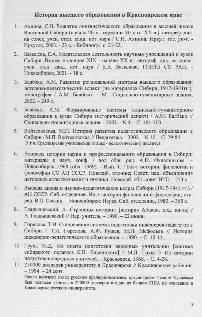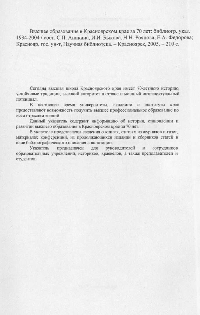 Библиографическое описание: Высшее образование в Красноярском крае за 70 лет : библиографический указатель 1934-2004 гг. / Красноярский государственный университет. Научная библиотека ; сост.: С. П. Аникина, И. И. Быкова, Н. Н. Роянова, Е. А. Федорова. - Электрон. текстовые дан. (pdf, 52.5 Мб). - Красноярск : КрасГУ, 2005. - 210 с. - Загл. с титул. экрана. - Электрон. версия печ. публикации . - Б. ц. - Текст : непосредственный + Текст : электронный.