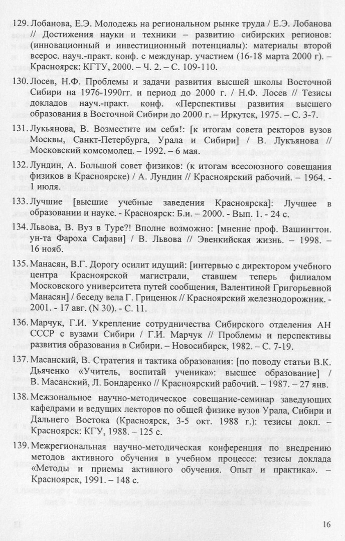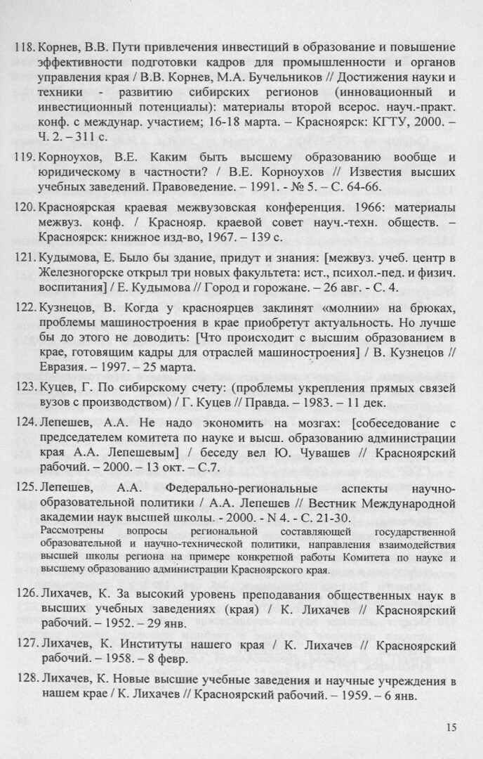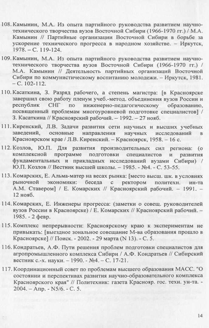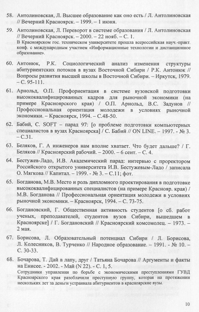 Библиографическое описание: Высшее образование в Красноярском крае за 70 лет : библиографический указатель 1934-2004 гг. / Красноярский государственный университет. Научная библиотека ; сост.: С. П. Аникина, И. И. Быкова, Н. Н. Роянова, Е. А. Федорова. - Электрон. текстовые дан. (pdf, 52.5 Мб). - Красноярск : КрасГУ, 2005. - 210 с. - Загл. с титул. экрана. - Электрон. версия печ. публикации . - Б. ц. - Текст : непосредственный + Текст : электронный.