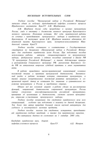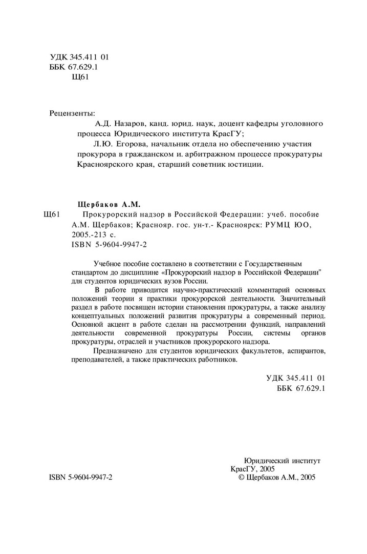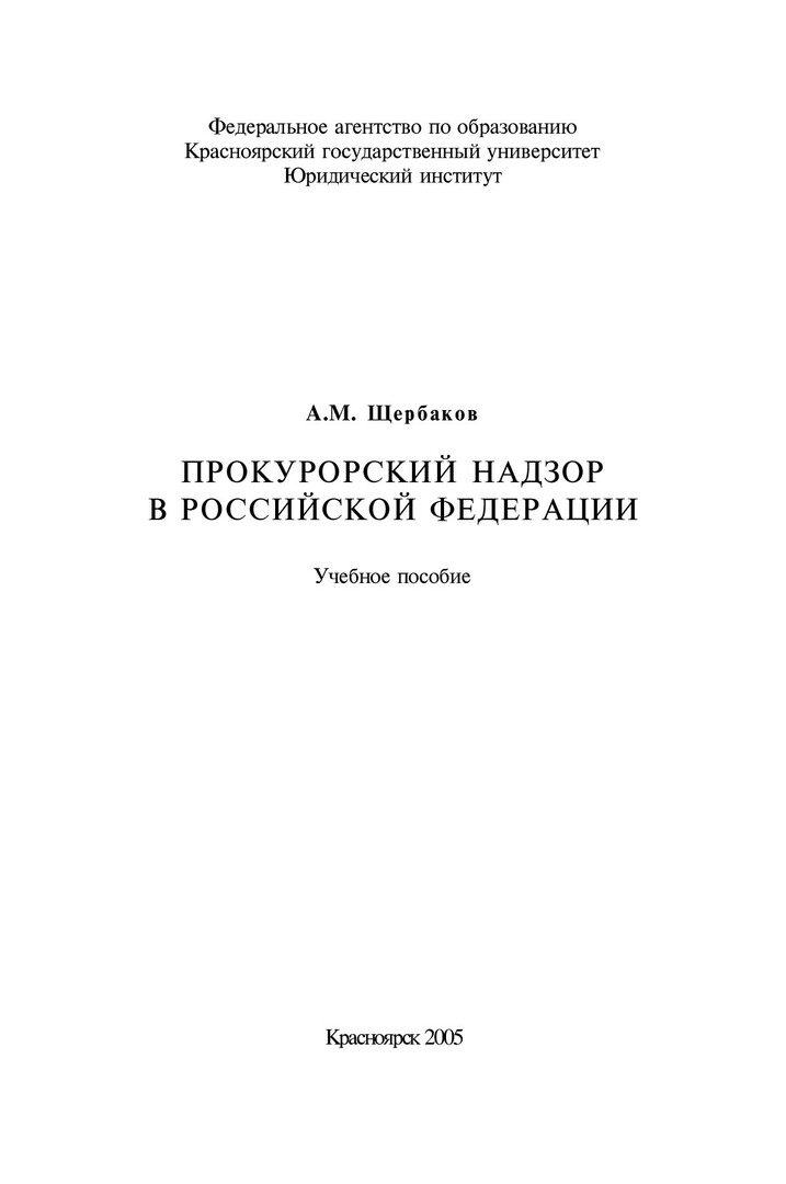 Библиографическое описание:Щербаков, Александр Михайлович. Прокурорский надзор в Российской Федерации : учебное пособие / А. М. Щербаков ; Краснояр. гос. ун-т, Юрид. ин-т. - Красноярск : КрасГУ, 2005. - 212 с. - ISBN 5-9604994-7-2 : 72.00 р. - Текст : непосредственный + Текст : электронный.