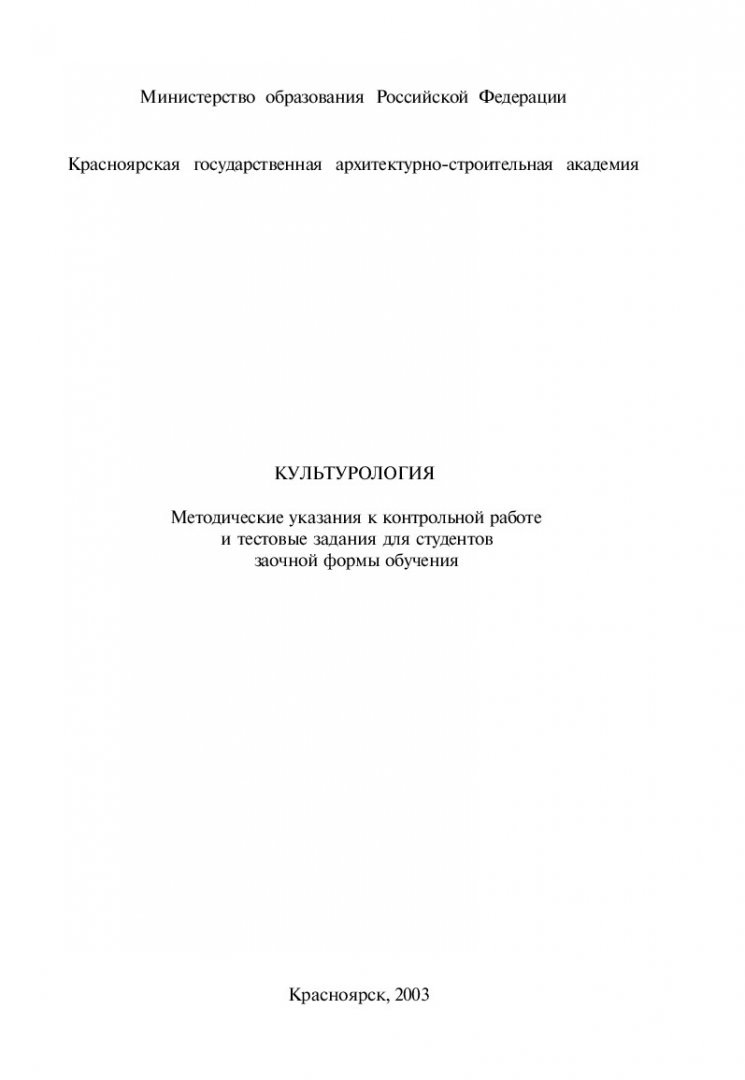 Библиографическое описание:Культурология : методические указания к контрольной работе и тестовые задания для студентов заочной формы обучения / сост. Л. Н. Евменова. - Электрон. текстовые дан. (161 Мб). - Красноярск : КрасГАСА, 2003. - 38 с. - Загл. с титул. экрана. - Электрон. версия печ. публикации
