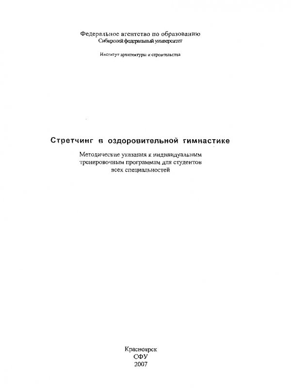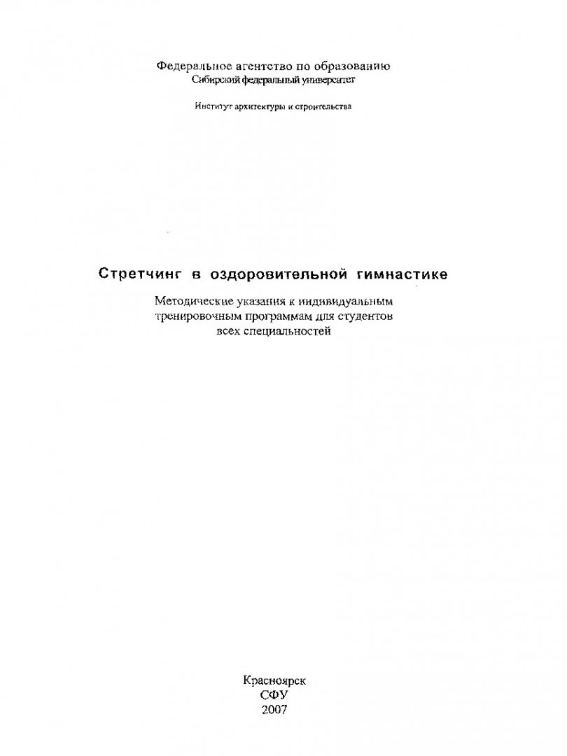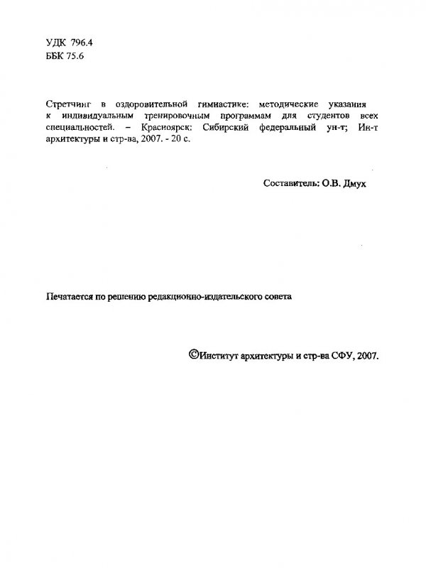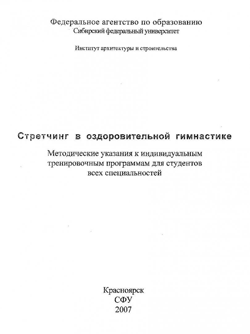 Библиографическое описание:Стретчинг в оздоровительной гимнастике : методические указания к индивидуальным тренировочным программам для студентов всех специальностей / сост. О. В. Дмух. - Красноярск : ИАС СФУ, 2007. - 19 с. : ил.