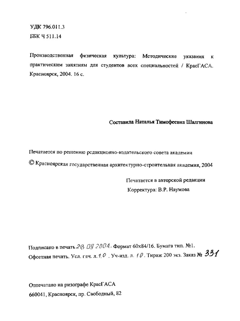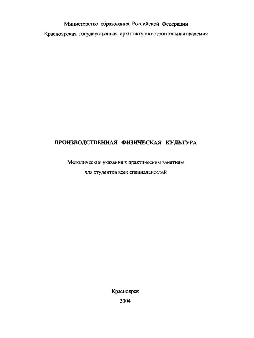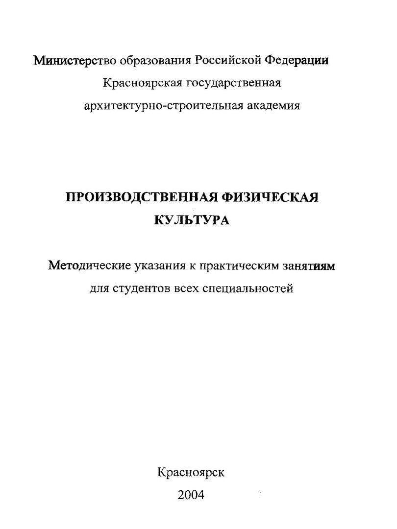 Библиографическое описание:Производственная физическая культура : метод. указания к практ. занятиям для студентов всех спец. / сост. Н.Т. Шалгинова. - Красноярск : КрасГАСА, 2004. - Текст : электронный.