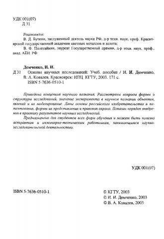 Библиографическое описание:Демченко, Игорь Иванович. Основы научных исследований : учеб. пособие / И. И. Демченко, В. А. Ковалев ; Краснояр. гос. техн. ун-т. - Красноярск : ИПЦ КГТУ, 2003. - 171 с. : ил. - Библиогр.: с. 155. - ISBN 5-7636-0510-1 : 20.00 р., б/ц . - Текст : непосредственный + Текст : электронный.