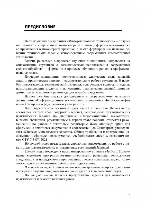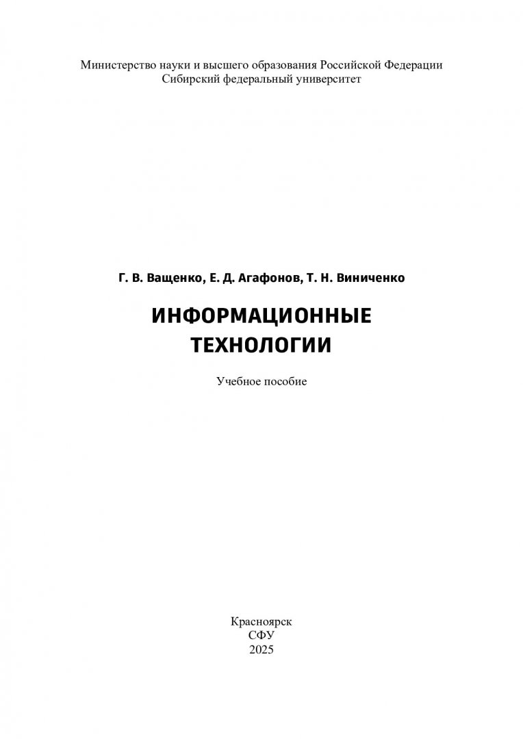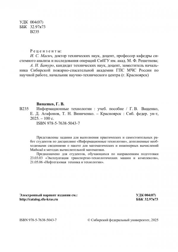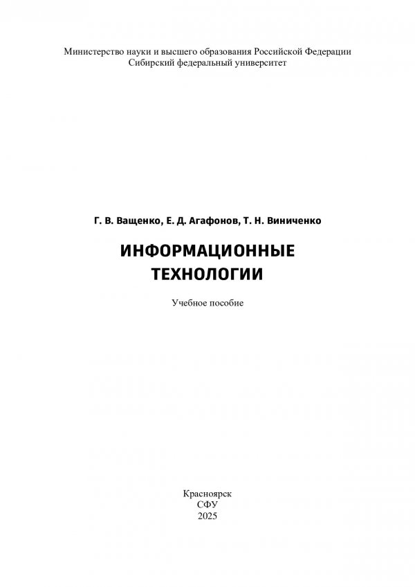 Библиографическое описание: Ващенко, Галина Вадимовна. Информационные технологии : учебное пособие / Г. В. Ващенко, Е. Д. Агафонов, Т. Н. Виниченко ; рец.: И. С. Масич, А. Н. Батуро ; Сибирский федеральный университет, Институт нефти и газа. - Электрон. текстовые дан. (pdf, 8.6 Мб). - Красноярск : СФУ, 2025 (2025-10-09). - 100 с., 6.3 усл. печ. л. : цв. ил. - Загл. с титул. экрана. - Электрон. версия печ. публикации . - Библиогр.: с. 99. - 100 экз. - ISBN 978-5-7638-5043-7 : Б. ц. - Изд. № 2024-22606. - Текст : электронный.