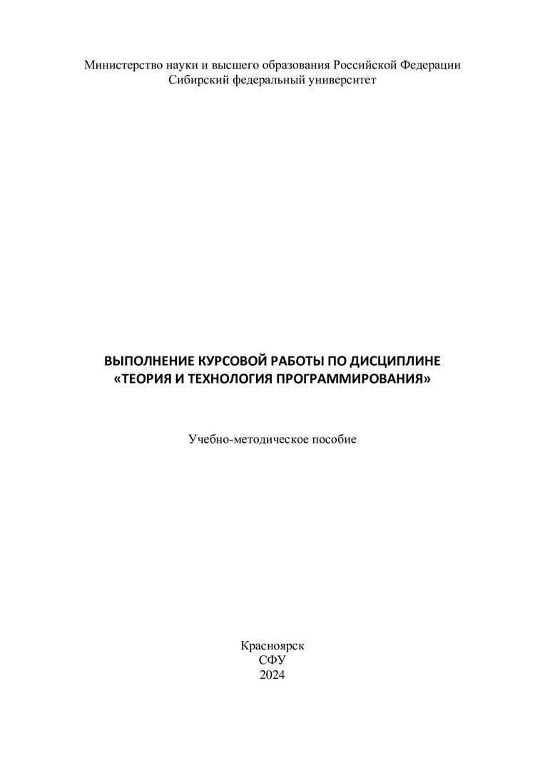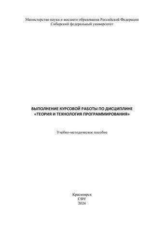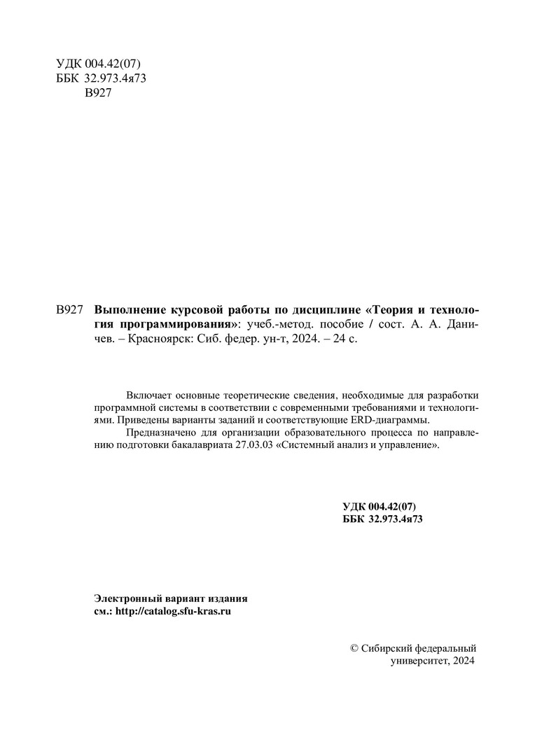 Библиографическое описание:Выполнение курсовой работы по дисциплине "Теория и технология программирования" : учебно-методическое пособие / сост. А. А. Даничев. - Красноярск : СФУ, 2024 (2024-07-30). - 24 с. - 100 экз. - Изд. № 2024-22334 : Б. ц. - Текст : непосредственный + Текст : электронный.