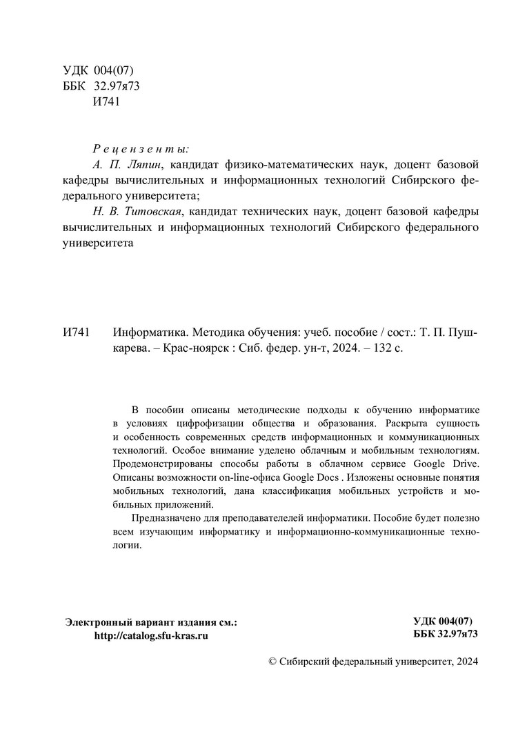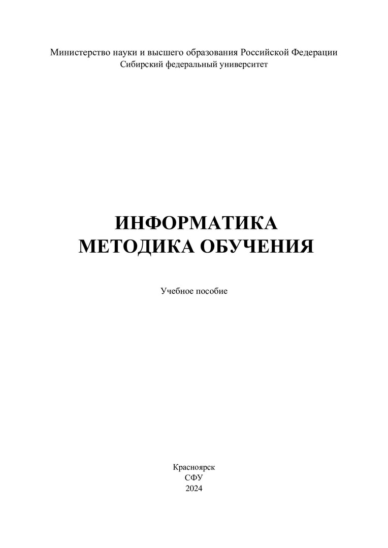 Библиографическое описание:Информатика. Методика обучения : учебное пособие / сост. Т. П. Пушкарева. - Красноярск : СФУ, 2024 (2024-08-05). - 132 с. - 100 экз. - Изд. № 2024-22395 : Б. ц. - Текст : непосредственный + Текст : электронный.