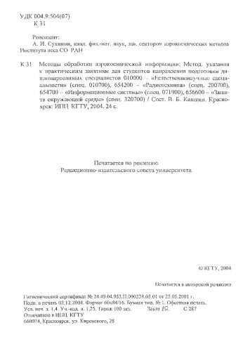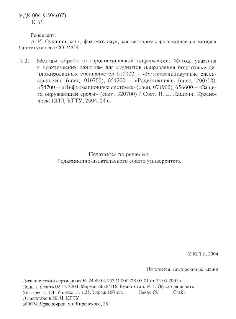 Библиографическое описание:Кашкин, Валентин Борисович. Методы обработки аэрокосмической информации : метод. указ. к практ. занятиям для студентов направления подгот. дипломир. спец. 010000, 654200, 654700, 656600 / В. Б. Кашкин ; Краснояр. гос. техн. ун-т. - Красноярск : ИПЦ КГТУ, 2004. - 24 с. - (Учебно-методическая литература). - Загл. с титул. экрана. - 100 экз. - Текст : электронный.