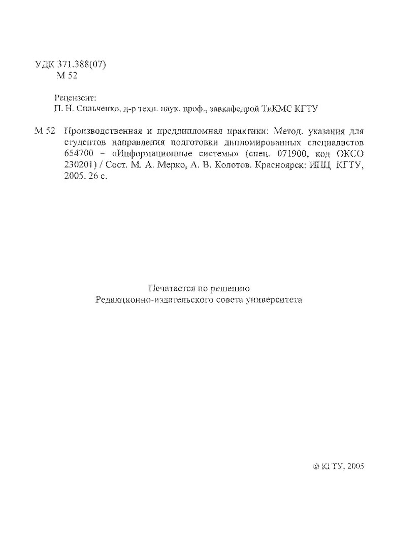 Библиографическое описание:Мерко, Михаил Алексеевич. Производственная и преддипломная практики : метод. указ. для студентов направления подготовки дипломир. спец. 654700 / М. А. Мерко, А. В. Колотов ; Краснояр. гос. техн. ун-т. - Красноярск : ИПЦ КГТУ, 2005. - 26 с. - (Учебно-методическая литература). - Загл. с титул. экрана. - 100 экз. - Текст : непосредственный + Текст : электронный.