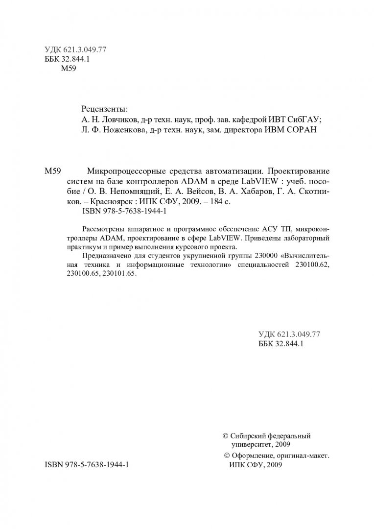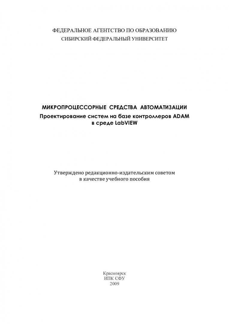 Библиографическое описание:Микропроцессорные средства автоматизации. Проектирование систем на базе контроллеров ADAM в среде LabVIEW : учебное пособие для студентов вузов / О. В. Непомнящий [и др.] ; Сиб. федерал. ун-т. - Красноярск : ИПК СФУ, 2009. - 183 с. : ил. - Библиогр.: с. 180. - 100 экз. - ISBN 978-5-7638-1944-1 : 73.00 р. - Текст : непосредственный + Текст : электронный.