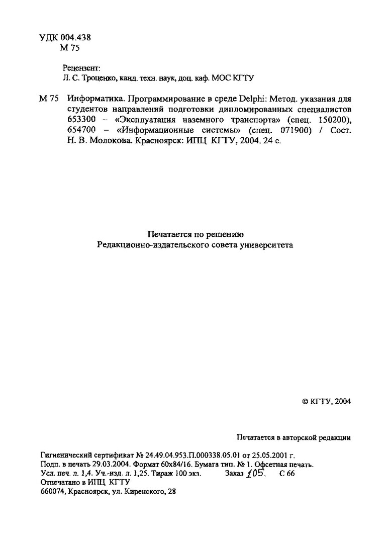 Молокова, Наталья Викторовна. Информатика. Программирование в среде Delphi : метод. указ. для студентов направлений подгот. дипломир. спец. 653300- "Эксплуатация наземного транспорта" (спец. 150200), 654700- "Информ. системы" ( спец. 071900) / Н. В. Молокова ; Краснояр. гос. техн. ун-т. - Красноярск : ИПЦ КГТУ, 2004. - 24 с. - Текст : непосредственный + Текст : электронный.
