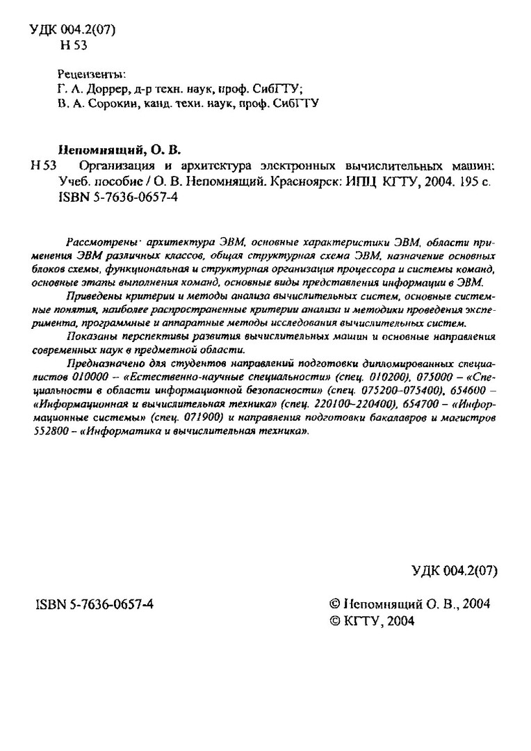 Библиографическое описание: Непомнящий, Олег Владимирович. Организация и архитектура электронных вычислительных машин : учебное пособие / О. В. Непомнящий ; Краснояр. гос. техн. ун-т. - Красноярск : ИПЦ КГТУ, 2004. - 195 с. - Библиогр.: с. 192. - ISBN 5-7636-0657-4 : 33.90 р. - Текст : непосредственный + Текст : электронный.